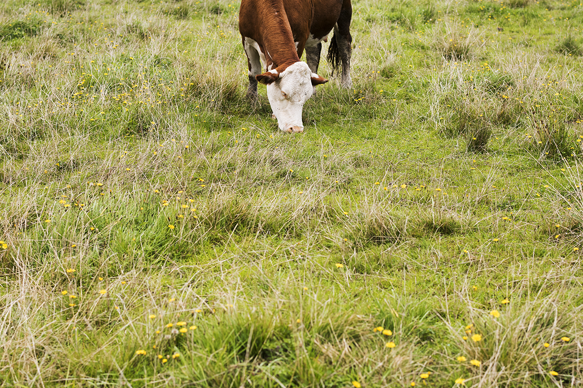 Herefordkor betar i hagarna på ön.
