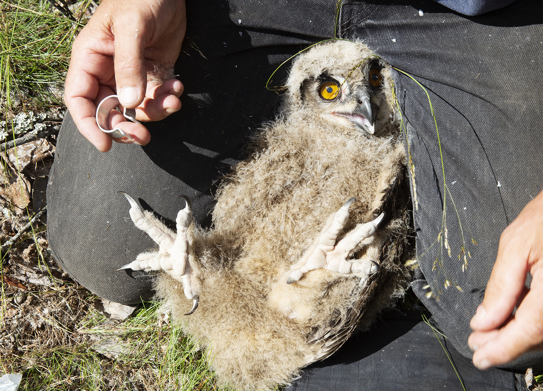 De storögda fluffbollarna fräser när han plockar upp dem men låter sig lugnt bäras iväg till en rymligare klippa. Alar Broberg lägger en av dem mellan låren och sätter fast en aluminiumring, större än vad som skulle passa på den grövsta människotumme. Ungarna måste ha lite att växa i, för snart hör de till världens största ugglor. Då har de en och en halv meter mellan vingspetsarna, stränga örontofsar och urbergets allvar i blicken. Då skulle ingen komma på tanken att ringmärka dem.