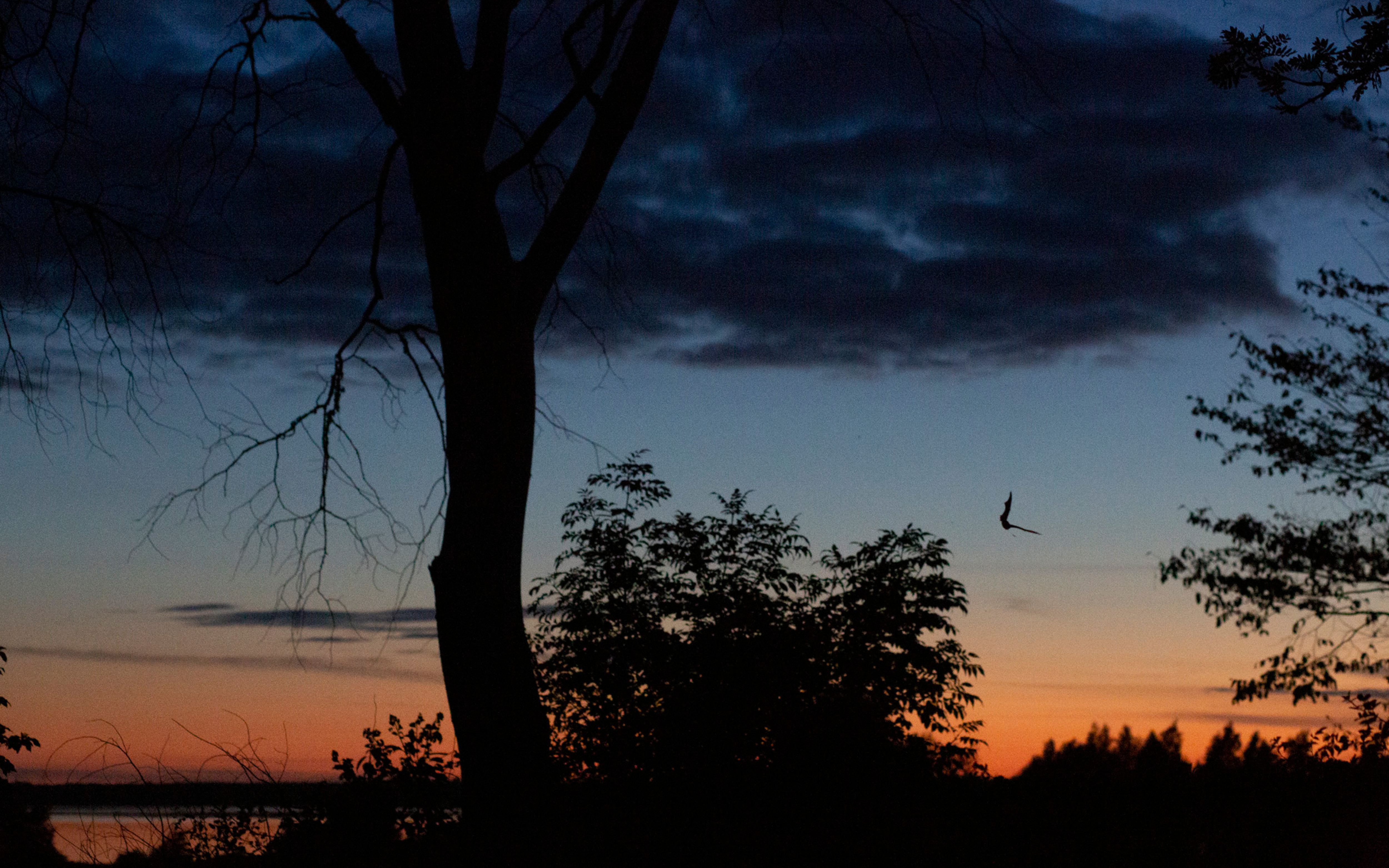 Grässtråna börjar förlora sina former och stjärnorna har tänts. Silhuetter av fladdermöss passerar mellan trädkronorna. Ingen går i nätet. Kylan och uppgivenheten börjar komma krypande. En kattuggla spökskriker från andra sidan sjön.