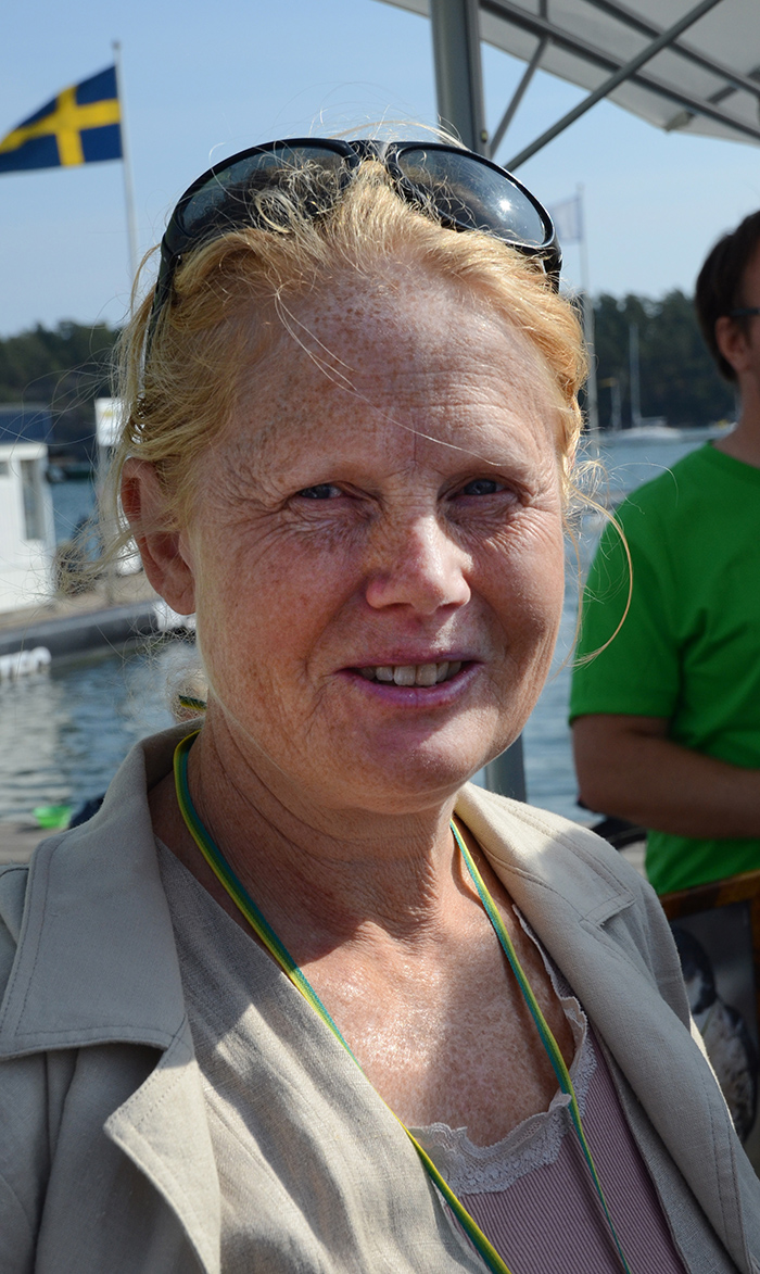 Hon och några andra kretsaktiva har dukat upp ett stånd på Skärgårdsmarknaden i hamnen. Här finns lådan med fyra sorters märken i trä, en bok med artnamn på olika språk och en artduk med färgbilder på 20 arter.