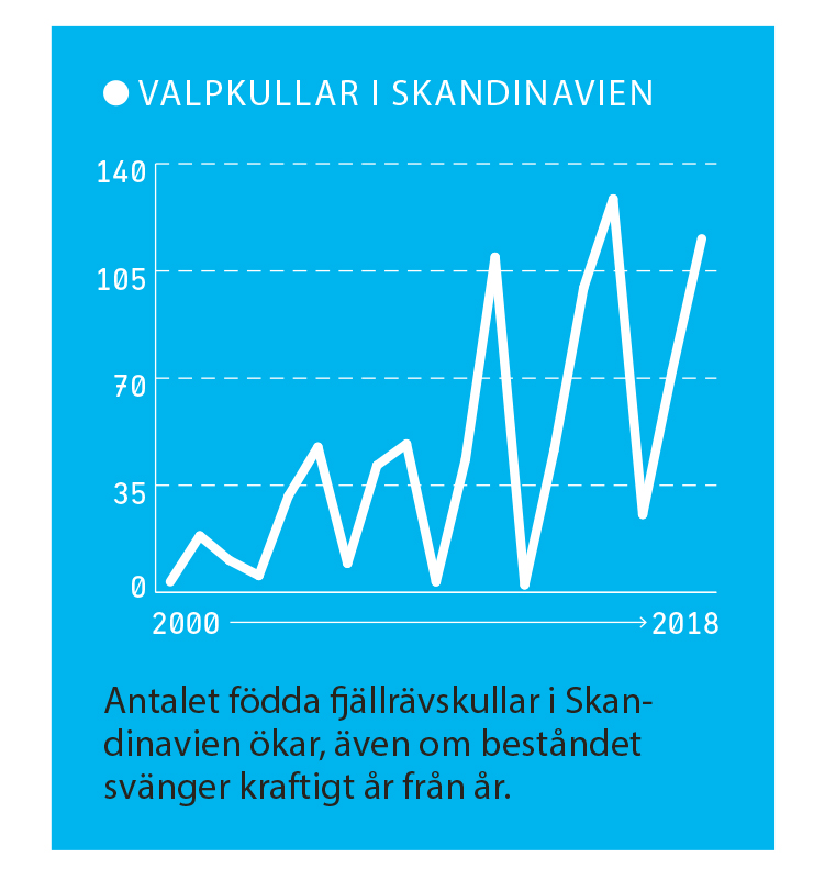 Sammanlagt hittade inventerarna närmare 50 svenska fjällrävskullar 2018, räknar man in den norska sidan föddes över 100 kullar längs fjällkedjan.