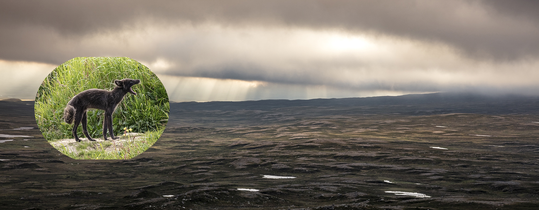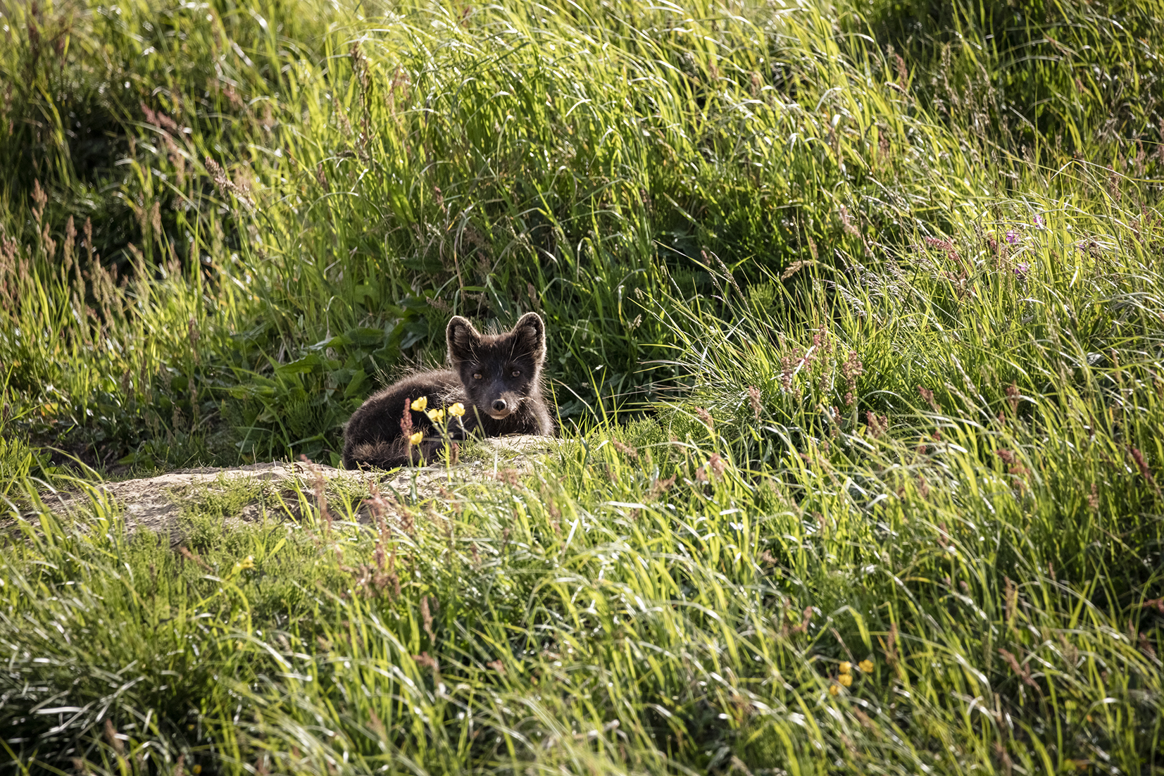 Plötsligt ser vi en rörelse, en mörk skugga i gräset som snart får sällskap av en till. En tredje fjällräv med ljusare päls går ned till bäcken för att dricka. Antagligen är det ett par med en fjolårsdotter som stannat kvar för att hjälpa till om det blir en ny kull med valpar.