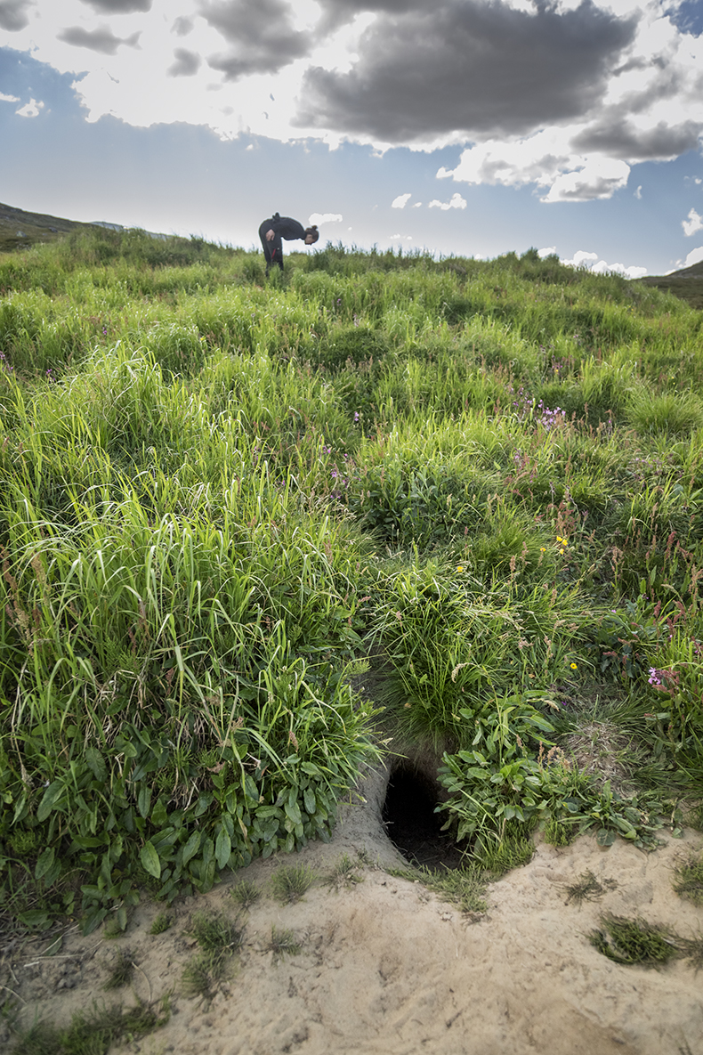 En kulle med frodigt grönt gräs och blommor sticker ut i det kargt grågröna landskapet där nere. Fjällrävar går inte långt för att göra ifrån sig och gödslingen avslöjar lyan.