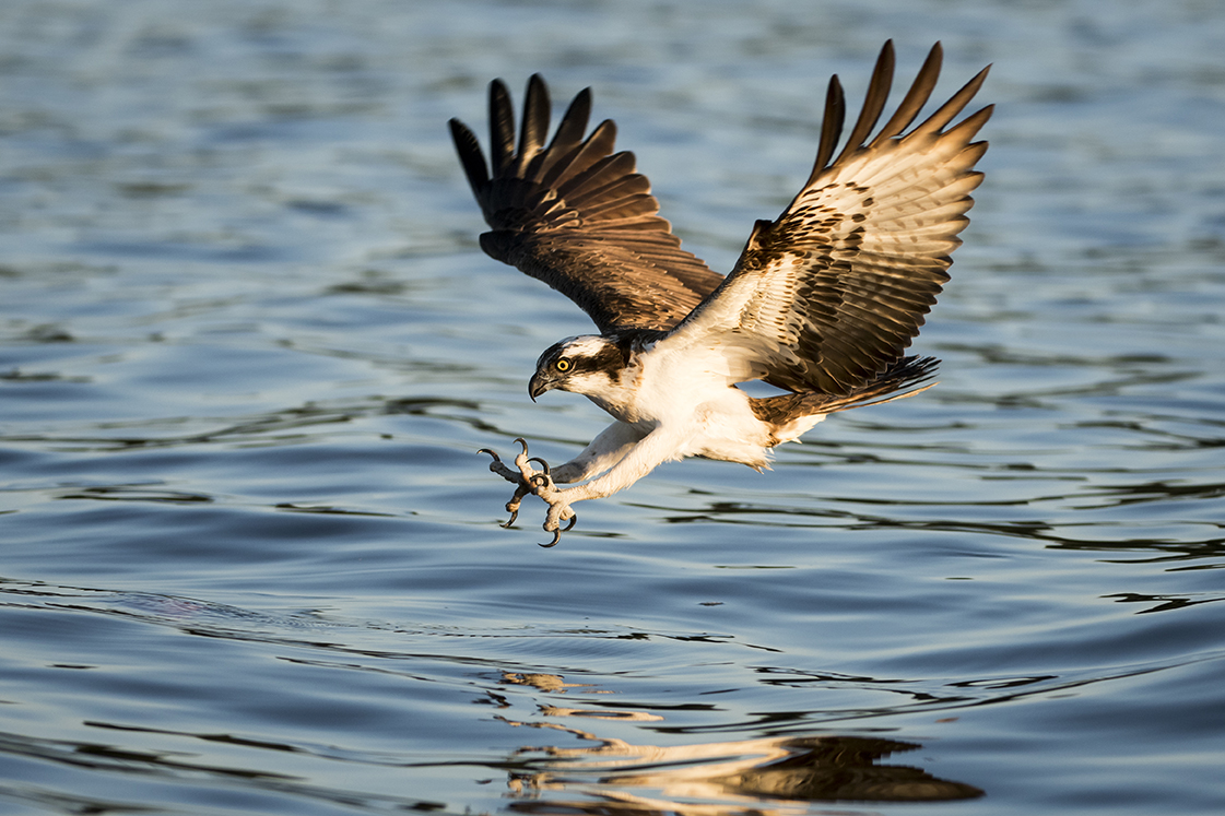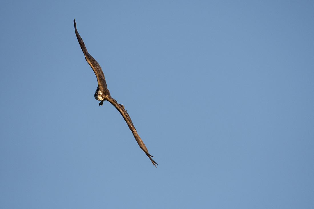 Snart syns en ljus rovfågelsilhuett högt uppe. Första frukostgästen. Fiskgjusen kollar läget en stund innan den sveper ned, plumsar i vattnet och lyfter med fisken i klorna. Det går snabbt, men man hinner ta in det fina mörka mönstret mot vit botten på vingarnas undersida.