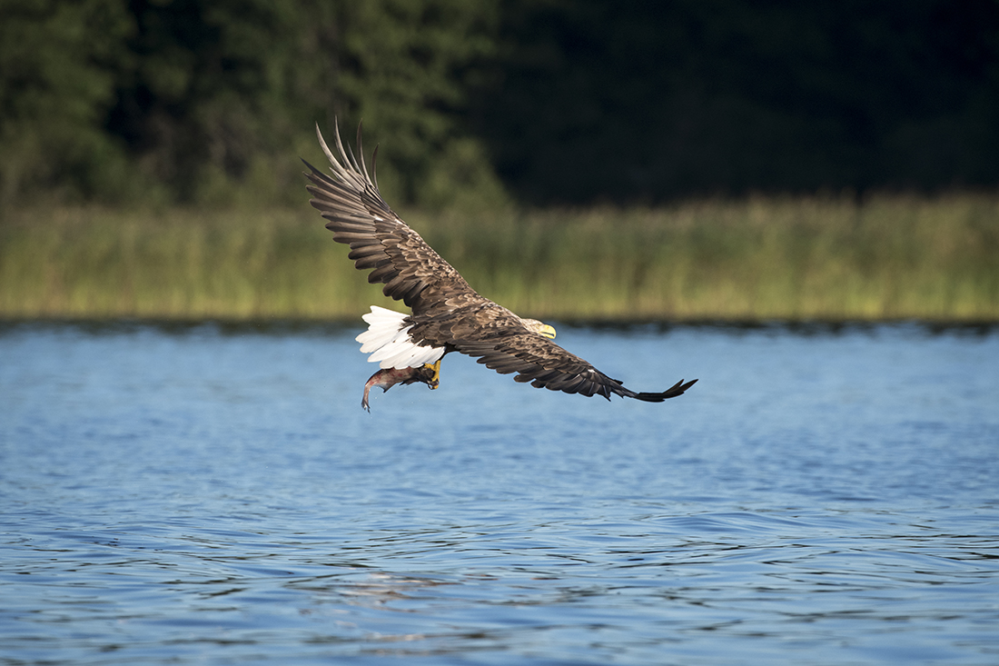 Örnen är 25 meter bort när den vänder tillbaka mot skogen, sätter sig i toppen av ett träd och spanar. Efter en stund vågar den ett nytt försök. Örnen dyker inte, utan nuddar mest vattenytan. Bara klorna droppar när den flyger mot skogen med den stora fisken i stadigt grepp.