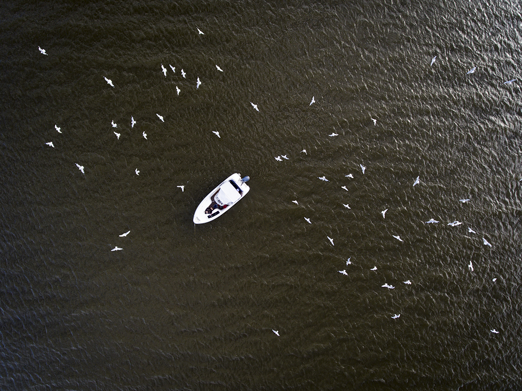 Mängden av måsar och trutar runt båten lockar havsörnarna.