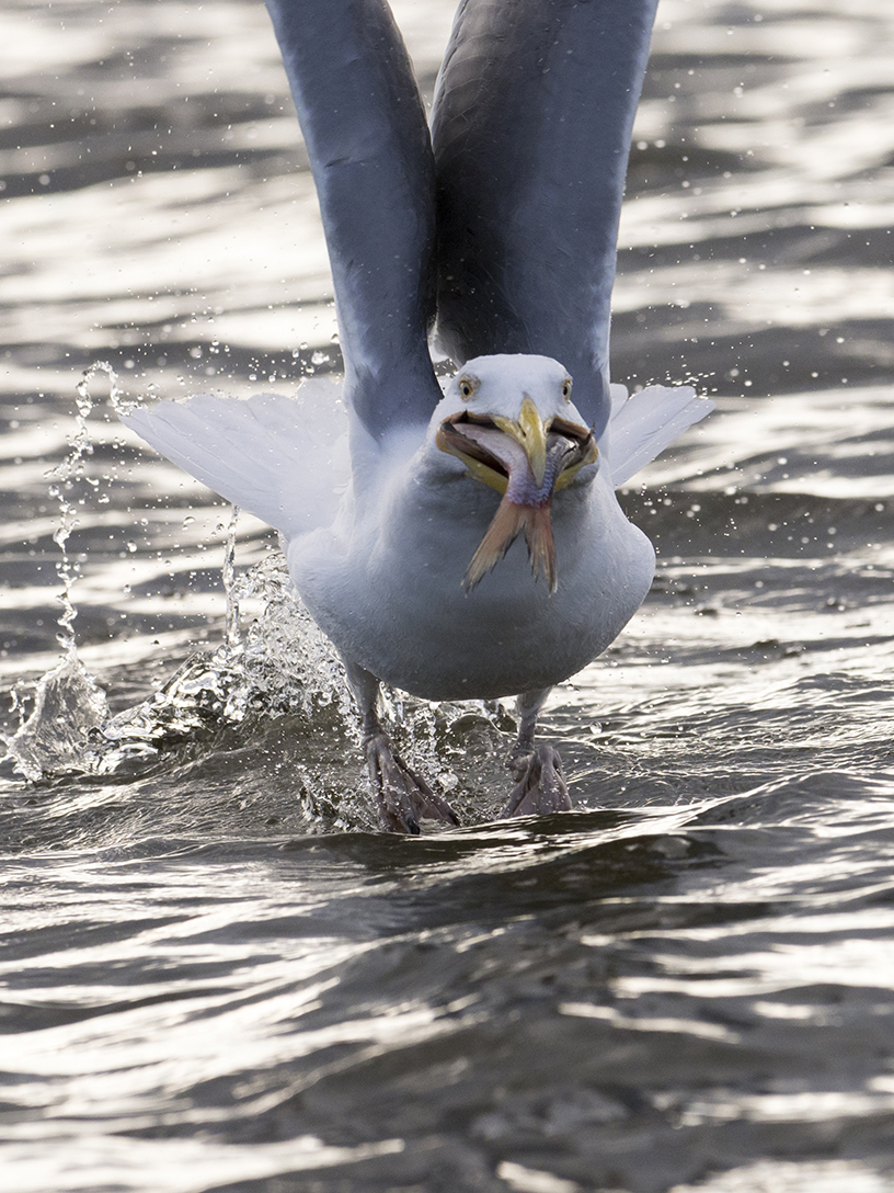 Plötsligt märks en oro bland måsarna. En mörk skugga lösgör sig ur skogen och med sugande kraftfulla vingslag närmar sig örnhannen. Om fiskgjusar är imponerande med vingspann på över en och en halv meter känns örnen som en verklig jätte, med uppåt en meter till. Den vassa blicken över den krökta gula näbben möter min.