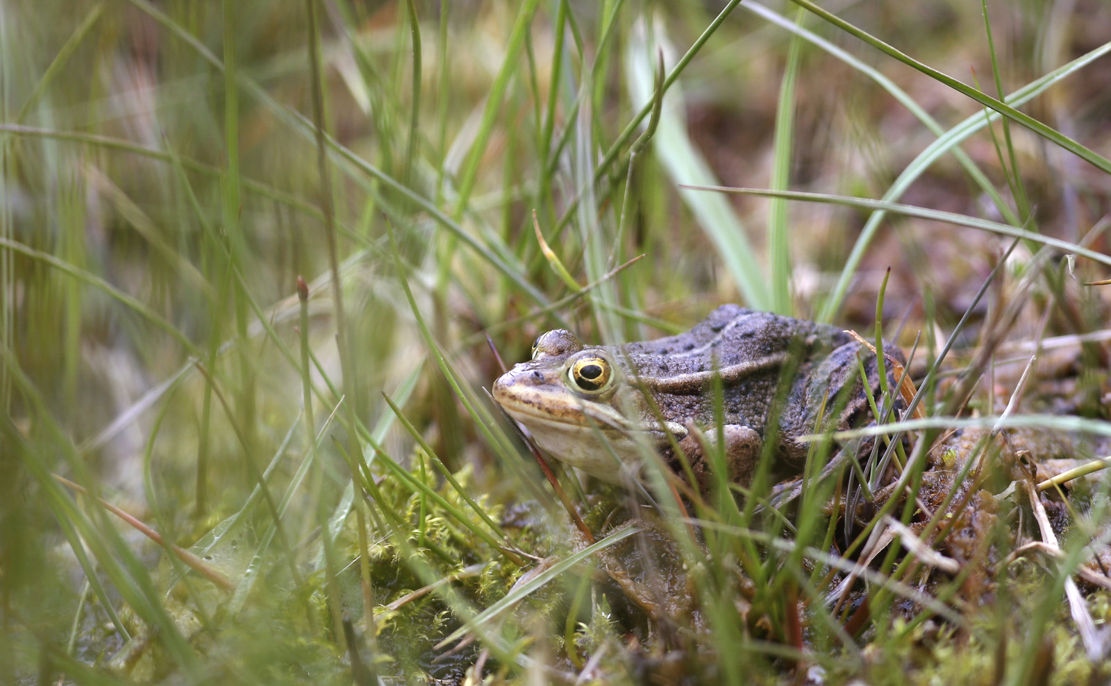 En svart avlång pupill blänker mitt i en guldskimrande iris. Bara ögonen högt på huvudet sticker upp ur det grumliga vattnet. Kroppen skiftar i gröna och bruna nyanser. Grodan ligger absolut stilla, perfekt kamouflerad, som en lurande miniflodhäst. När mina ögon vant sig ser jag en annan strax intill som lojt sparkar sig framåt.