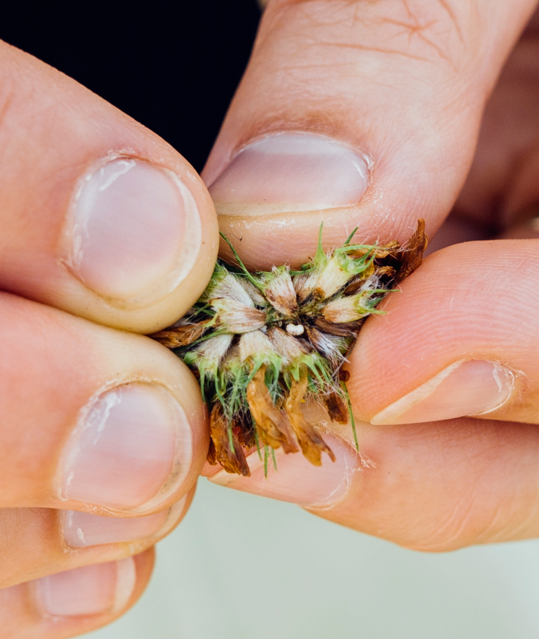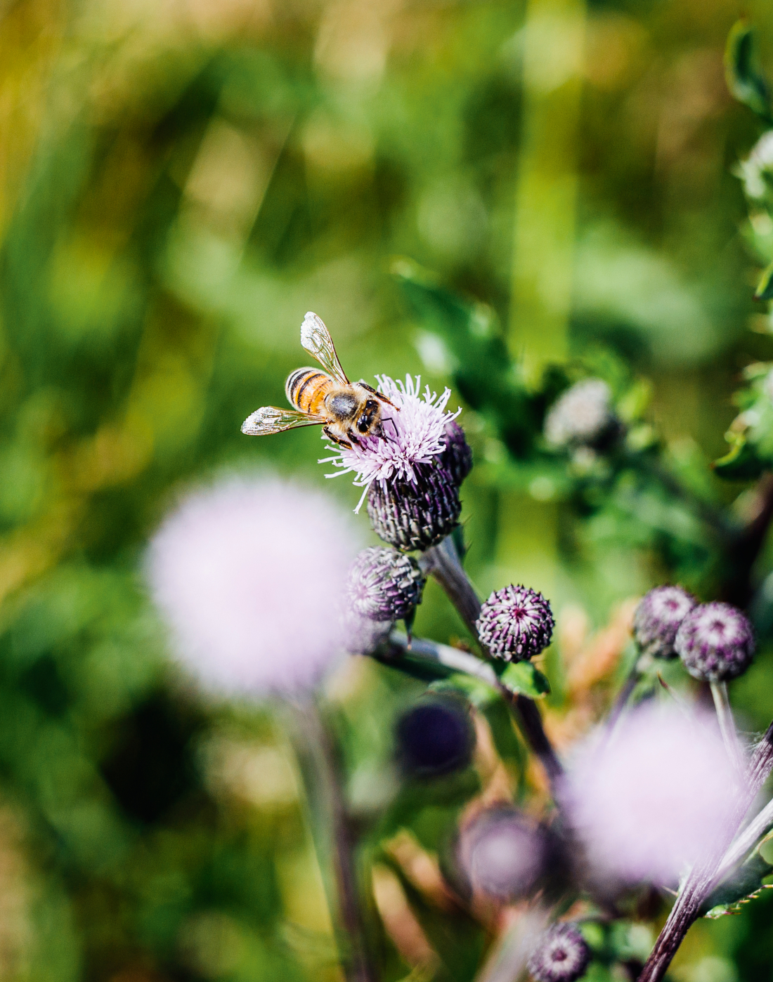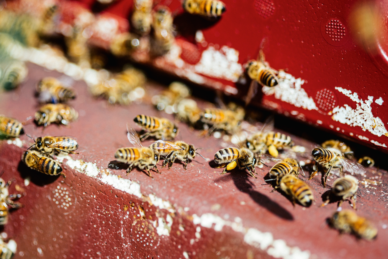 Vi ser flera vivlar i parningstagen och på en del blommor finns ingångshål med ägg eller larver innanför. En del av fälten är obesprutade, på andra används medel som neonikotinoiden tiakloprid. Vid bikuporna finns pollenfällor som liknar färgglada bollhav i miniatyr. Proverna ska analyseras för att se vilka växter bina samlar pollen från och hur mycket växtskyddsmedel de utsätts för.