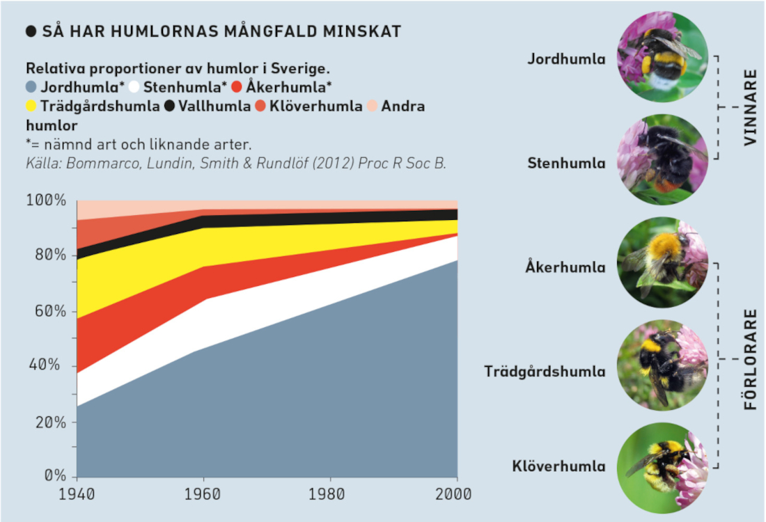 På 1940-talet var fördelningen jämn mellan många olika arter. Klöverhumlan dog ut i Skåne redan på 1960-talet, andra förlorare är åkerhumlan och trädgårdshumlan som gått ned kraftigt.