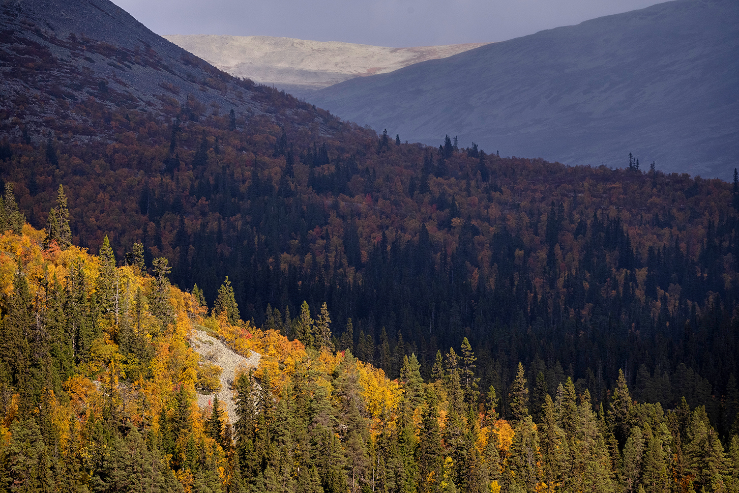 Vi stirrar vidare och bergen stirrar bistert tillbaka, med uråldrig, stålgrå blick. Högst upp är det bara stenskravel, dit har björnarna ingen anledning att gå. Men längre ner lyser marken i fjällbjörksgult och ripbärsrött, där någonstans borde de dyka upp. Tubkikarna vandrar över Gråsidan, Björnvålen, Sonfjället, Medstöten, Korpflyet och tillbaka igen.