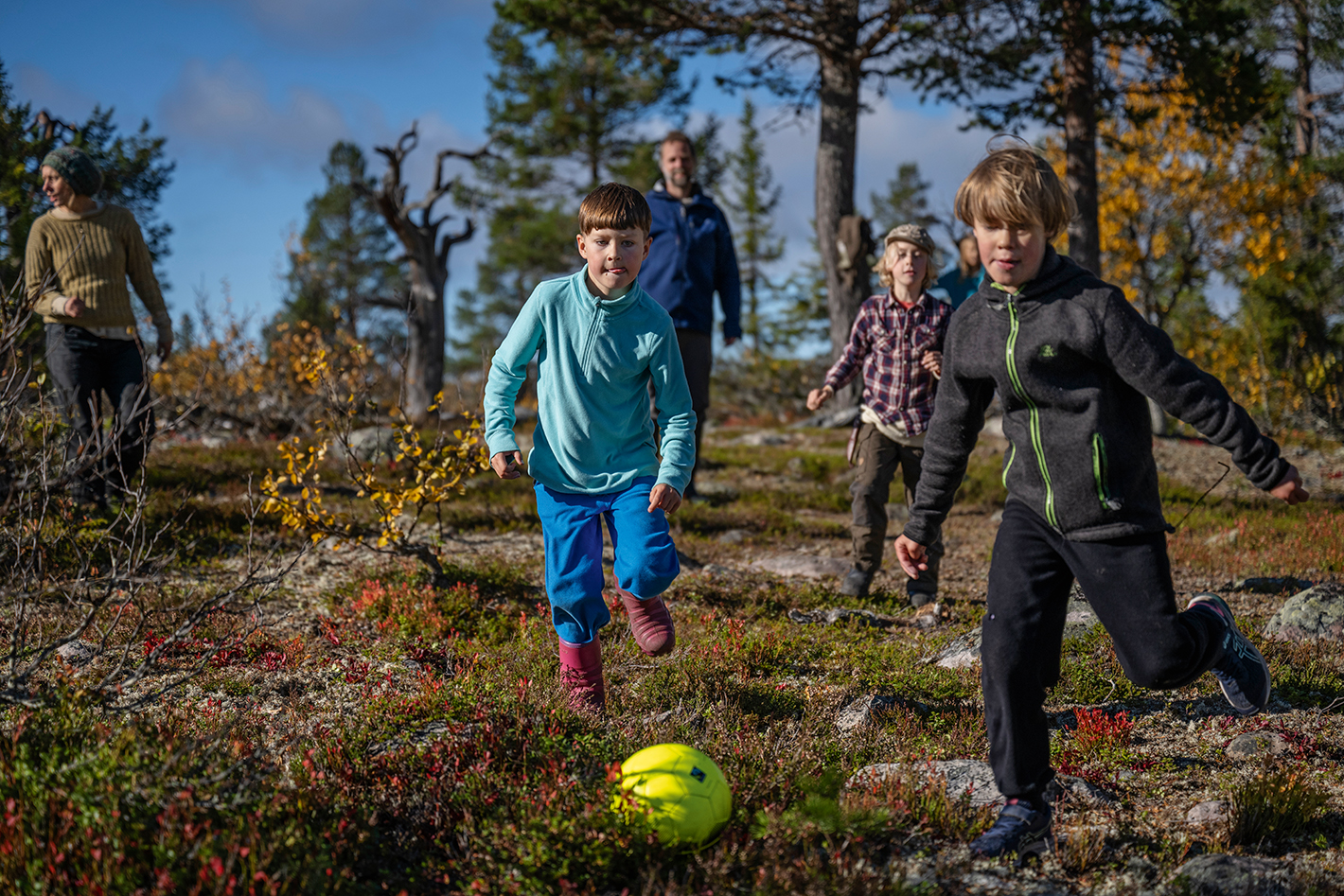 De fem barnen drar igång en fotbollsmatch mellan stenbumlingar och gammeltallar. Fördelen med att spana på ett par kilometers håll är att man inte behöver sitta tyst och stilla. Fotbollsmatchen bryts tvärt av ett rop: JÄRV! Blixtsnabbt formas en kö vid tubkikarna tills alla fått se en mörk klump som rör sig över fjället i karakteristiskt klunsig järvgalopp.