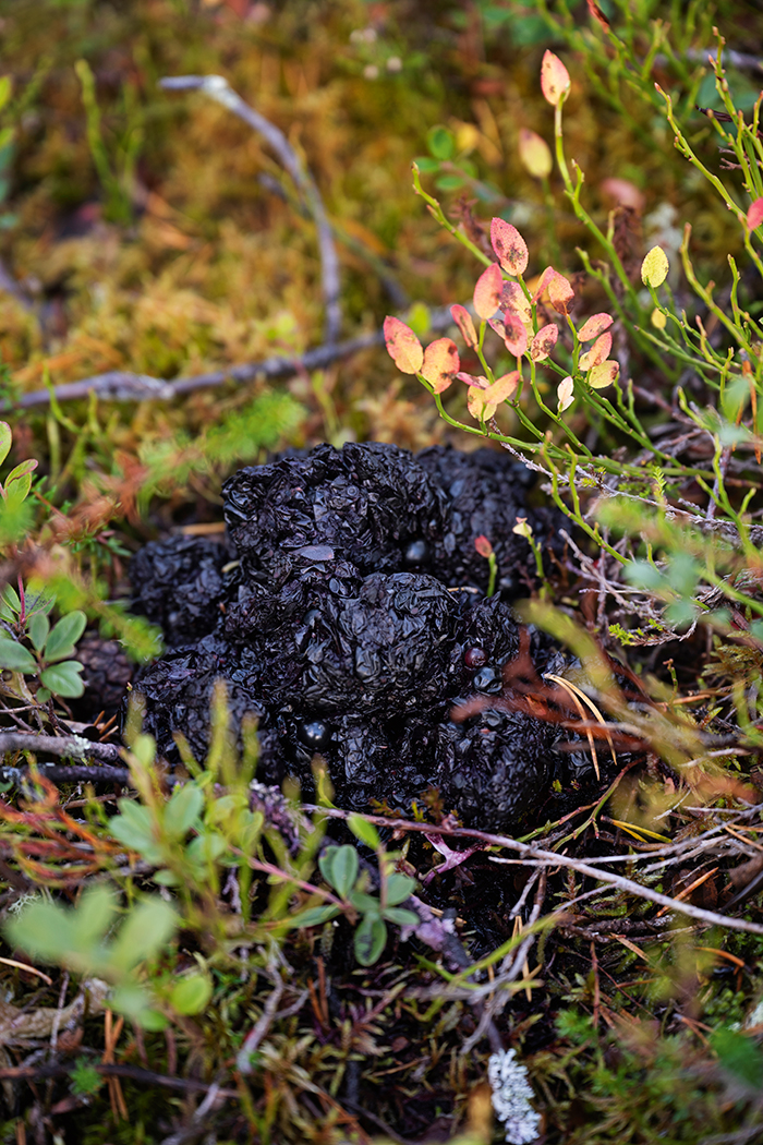 Att björnarna är i närheten råder inget tvivel om. Överallt kring Torrsmolet ligger färska spillningshögar, mörkt blåsvarta och överfulla med bär. Om man lade en av högarna på en tallrik skulle den kunna passera som snygg bärkompott på Instagram. Hundra meter ner i sluttningen finns rivmärken efter björnklor i en torrfura, och längs en vandring ner i dalgången syns inte en enda hel myrstack. Varenda en är utriven eller tillplattad, vissa med spår efter stora tassar. Överallt jobbar myrorna på med att renovera ruinerna.