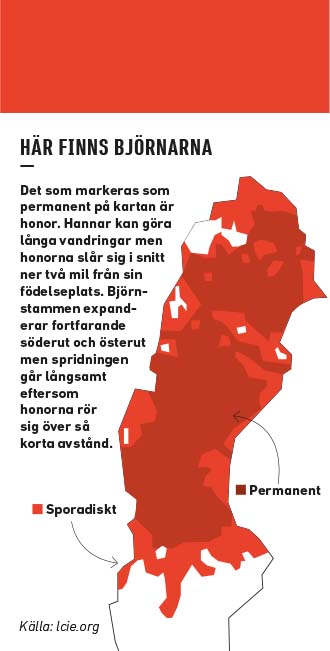 − Att få se en björn som går ostörd och äter bär, det är en dröm som man har haft hela livet. Ofta har man ju stört djuren man ser, säger Johan Falck som följt med på expeditionen. Han var tidigare naturbevakare i Västerbotten och har sett många björnar i sina dagar, vissa lite väl nära. I jobbet ingår bland annat att ta en hörntand från varje skjuten björn. Ett oromantiskt slit med tång och stämjärn.