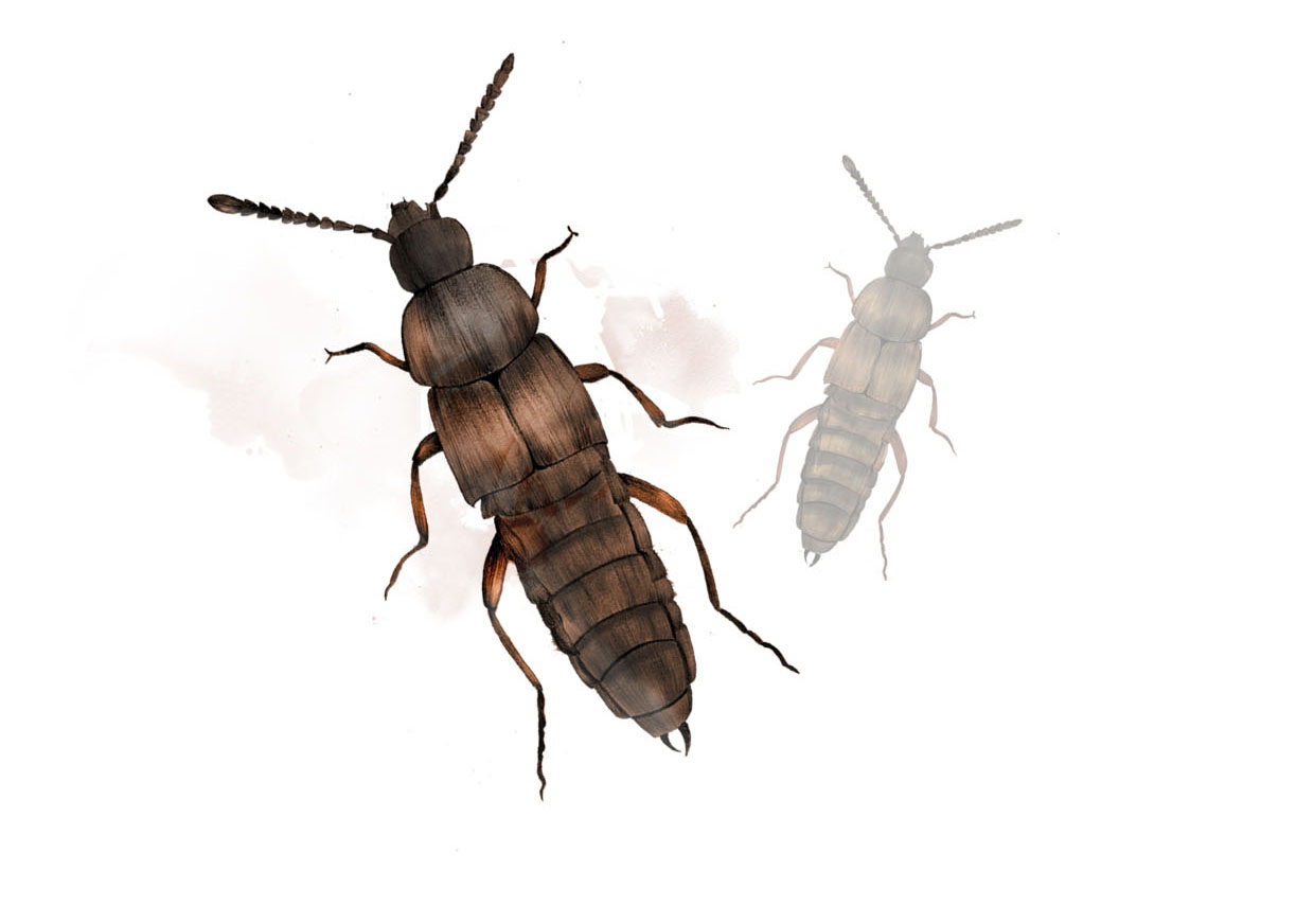 Några av alla de små skalbaggar som är aktiva under snön är kortvingar av släktet Oxypoda. De lever av spillning från sorkar och möss, och de följer i smågnagarnas spår både sommar och vinter.