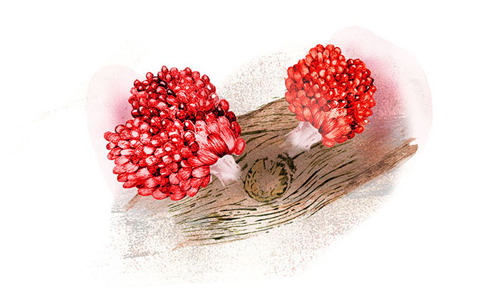 Hos bikakesvampen sitter fruktkropparna tätt ihop så att den liknar stora hallon som sticker ut från stubbar och fallna träd. När slemsvampen mognar försvinner den röda hallonfärgen och de små bollarna blir mer lila eller bruna. Detta är en av de tidigaste arterna som kan dyka upp redan i maj