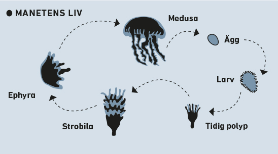 Maneter växlar mellan två generationer som ser helt olika ut. Maneterna som vi ser släpper larver som simmar ner till botten och sätter sig fast. Där blir de så kallade polyper som liknar små havsanemoner. Polyperna släpper sedan ifrån sig tallrikslika ”medusor” som blir till stora maneter.