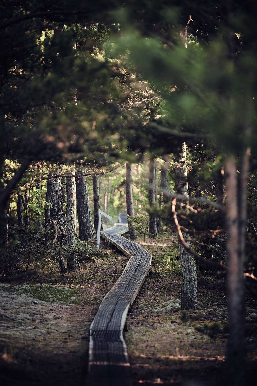 Vägen mot fyrbyn går genom en pelarsal av gammeltall. Stammarna skjuter upp ur mjuka kuddar av mossa och ljung, ibland med färgklickar av gulvit ängskovall. Vågbruset hörs inte hit, bara småfågelkvitter och knarr från grenar som gnider mot varandra. Fällen och torrakor bäddar för ovanliga och stora skalbaggar som smedbock och timmerman.