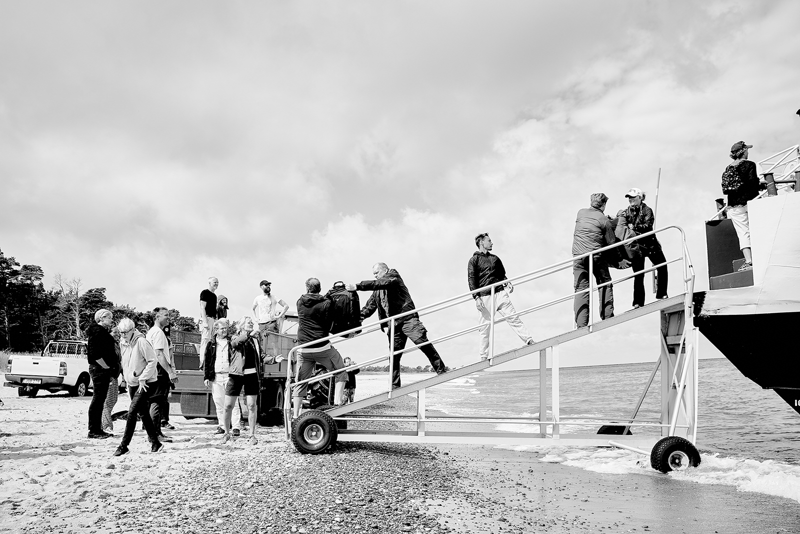 Vi har tur och hamnar på den närmaste sandstranden Las Palmas. Passagerarna bildar kedja och langar bagage och kylväskor nedför landgången till väntande traktorvagn. Härifrån är det nära till Säludden, en bra startpunkt för att ta in ön.