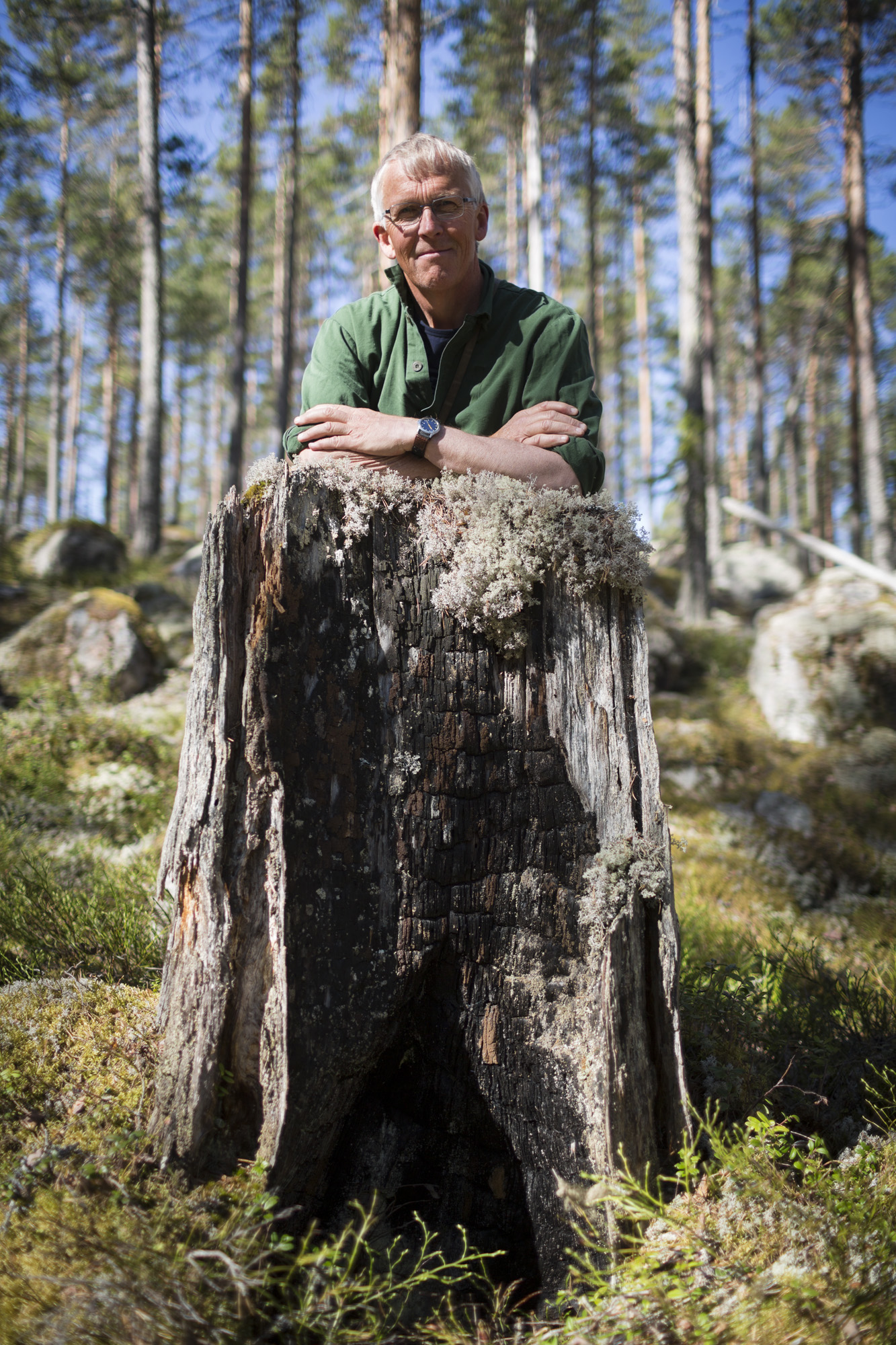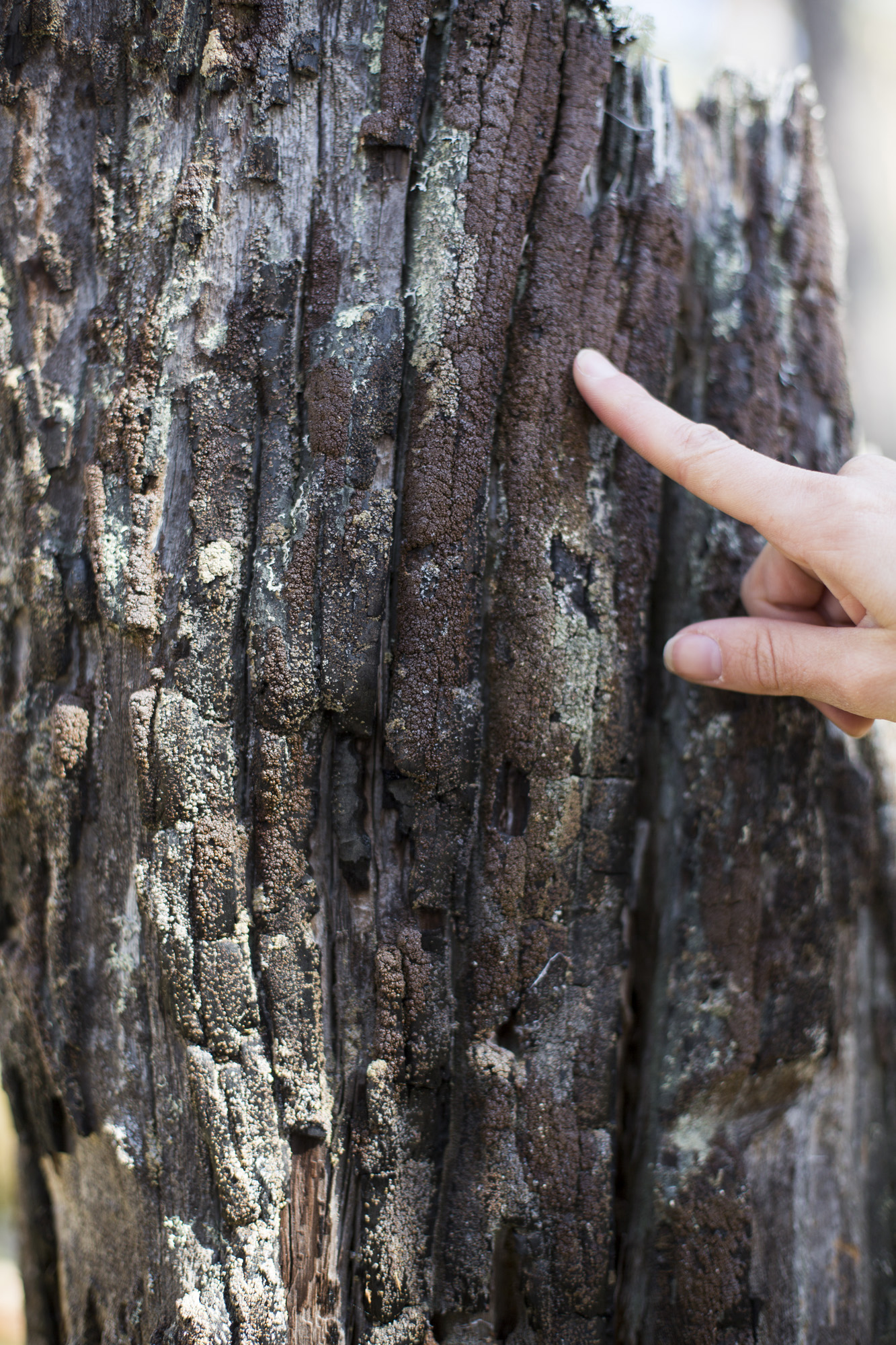 På just den här sortens gamla brandstubbar trivs mörk kolflarnlav, berättar Helena och pekar ut de bruna lavarna som liknar kinapuffar i luppen. De är rester av den gamla tallurskogen där skogsbränderna formade landskapet.