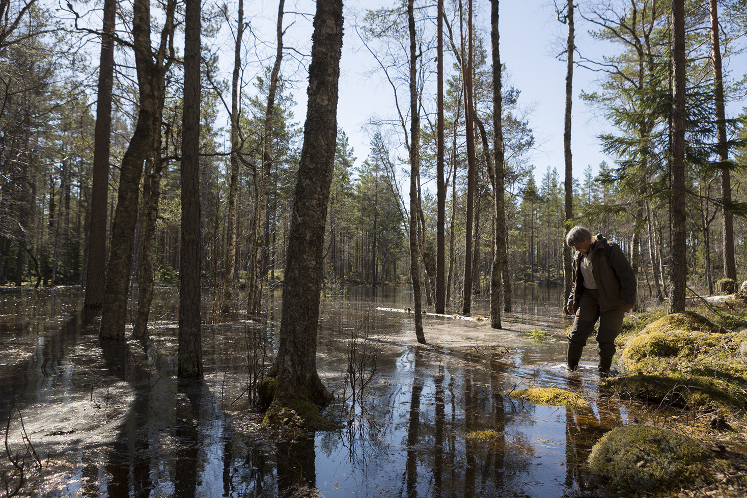 Nedanför den steniga sluttningen ligger en liten vät, spegelblank som om den vore en portal in i en annan, upp och nervänd, skog. I strandkanten står en grov asp, gråluddig av signalarten korallblylav. Från hålet högre upp på stammen stirrar en pärluggla länge på oss med klotrunda ögon, antagligen ovan vid en tiohövdad publik.