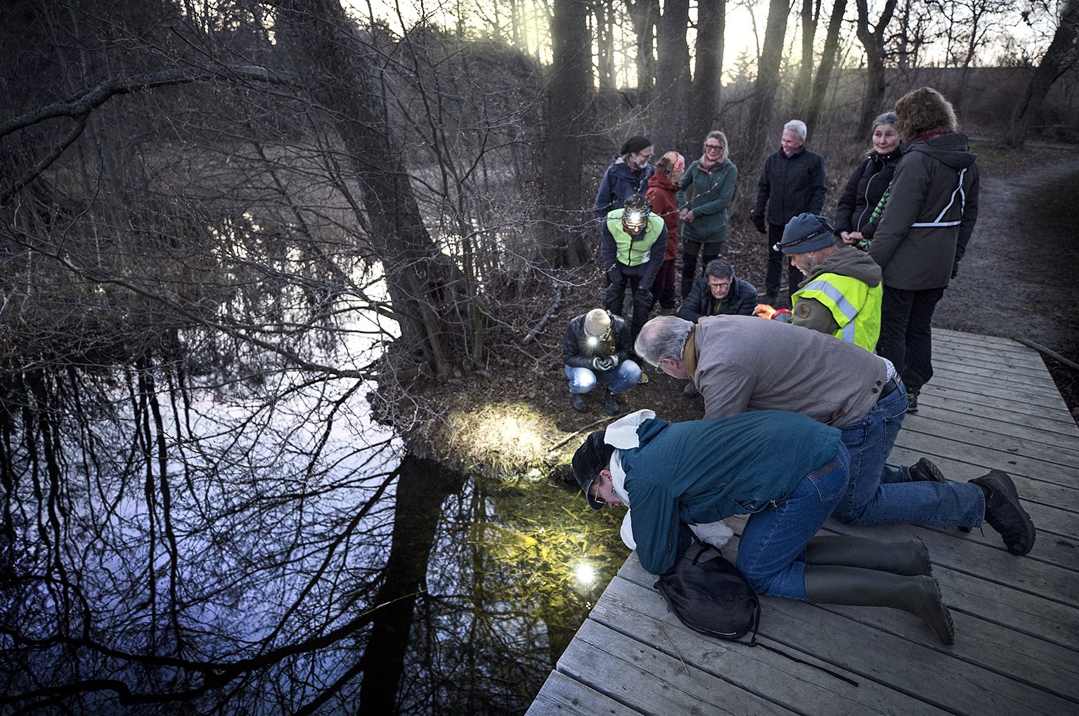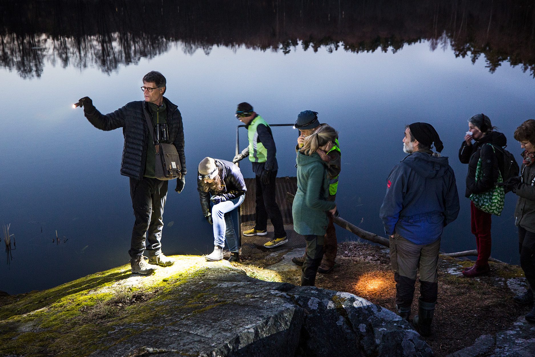Mörkret faller medan gruppen söker efter groddjur i området runt Stockbysjön.