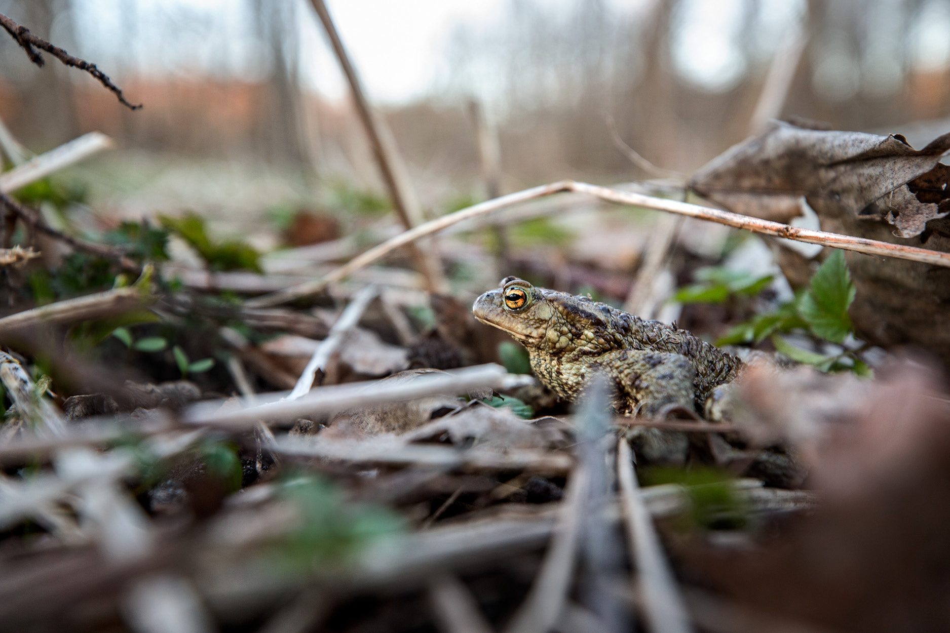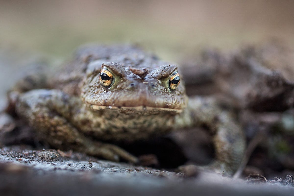 Ett par vanliga paddor som Isak Isaksson hittat strax ovanför vägen finns redan på plats. Huden är vårtig och grågrön men ögonen skimrar i guld och svart.