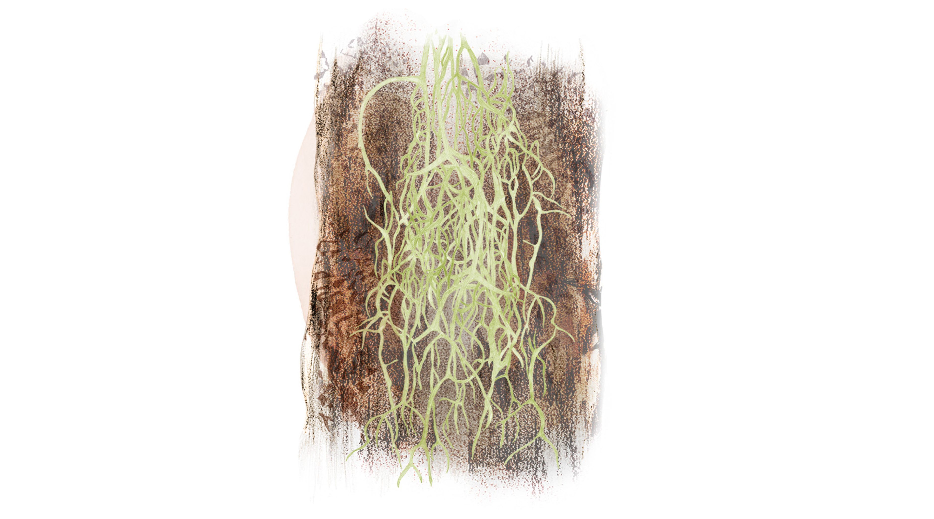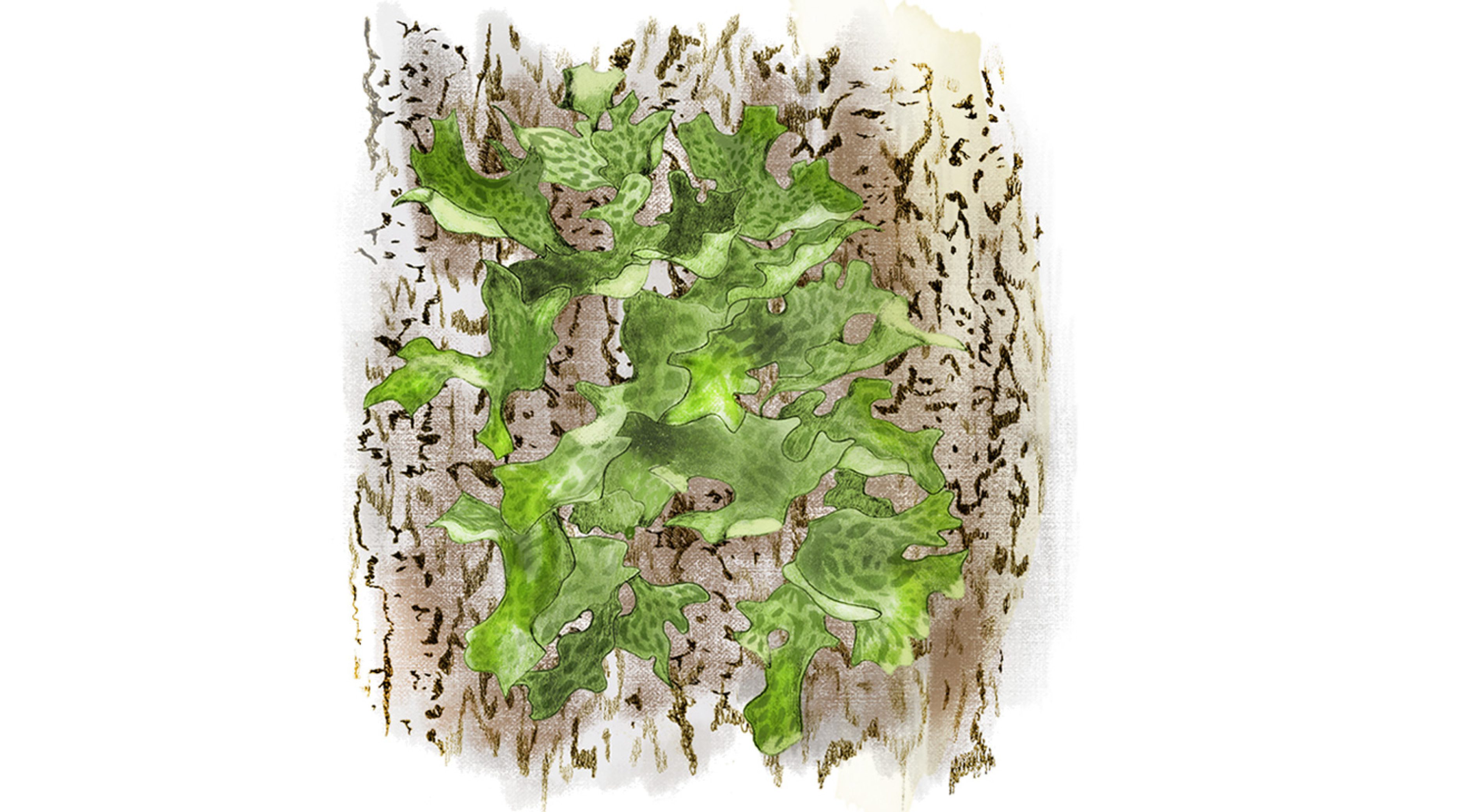 Ibland växer den på liggande träd, och signalerar då att tiden har stått nästan stilla – de grova träden har multnat långsamt och inga avverkningar har