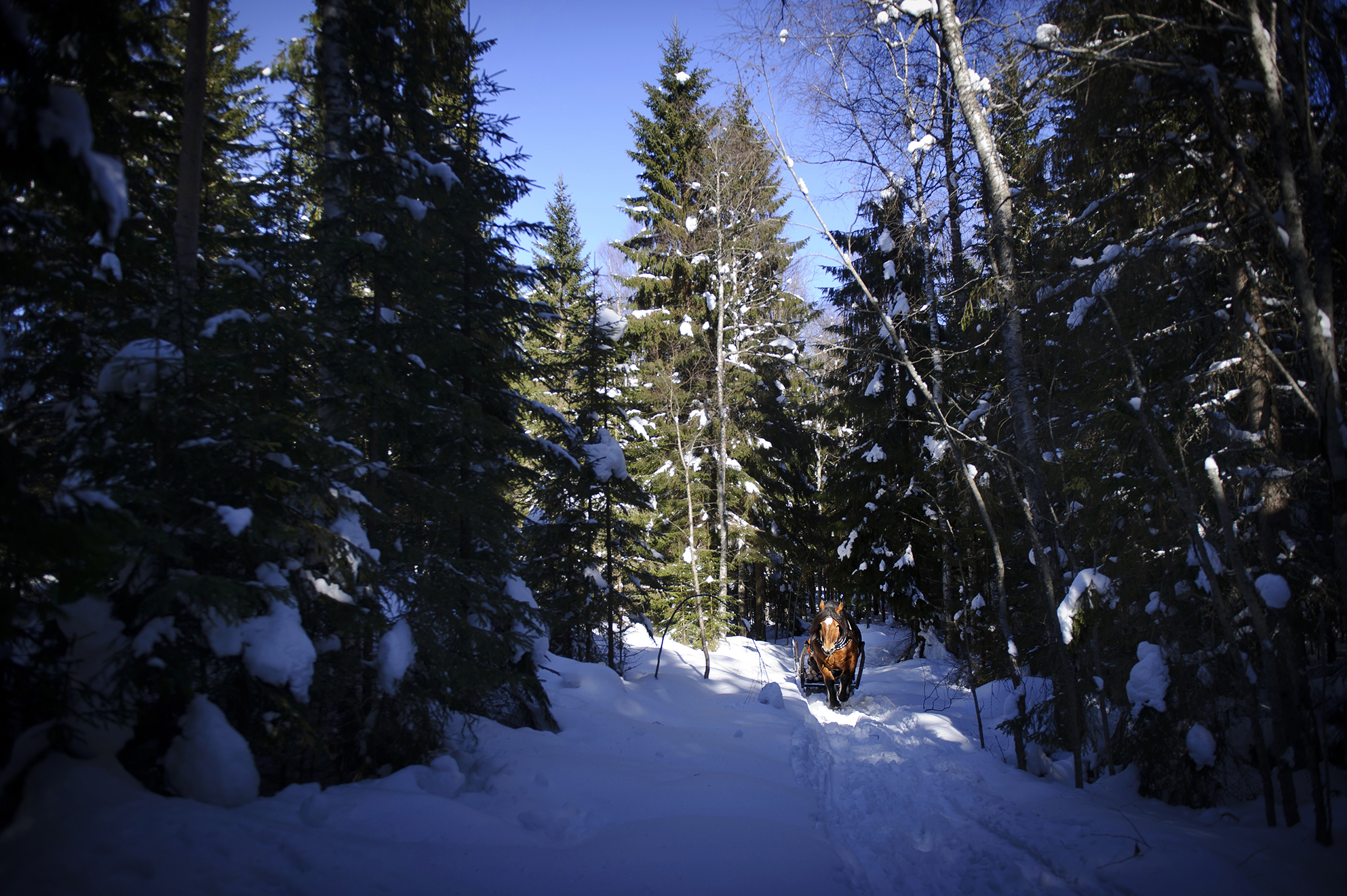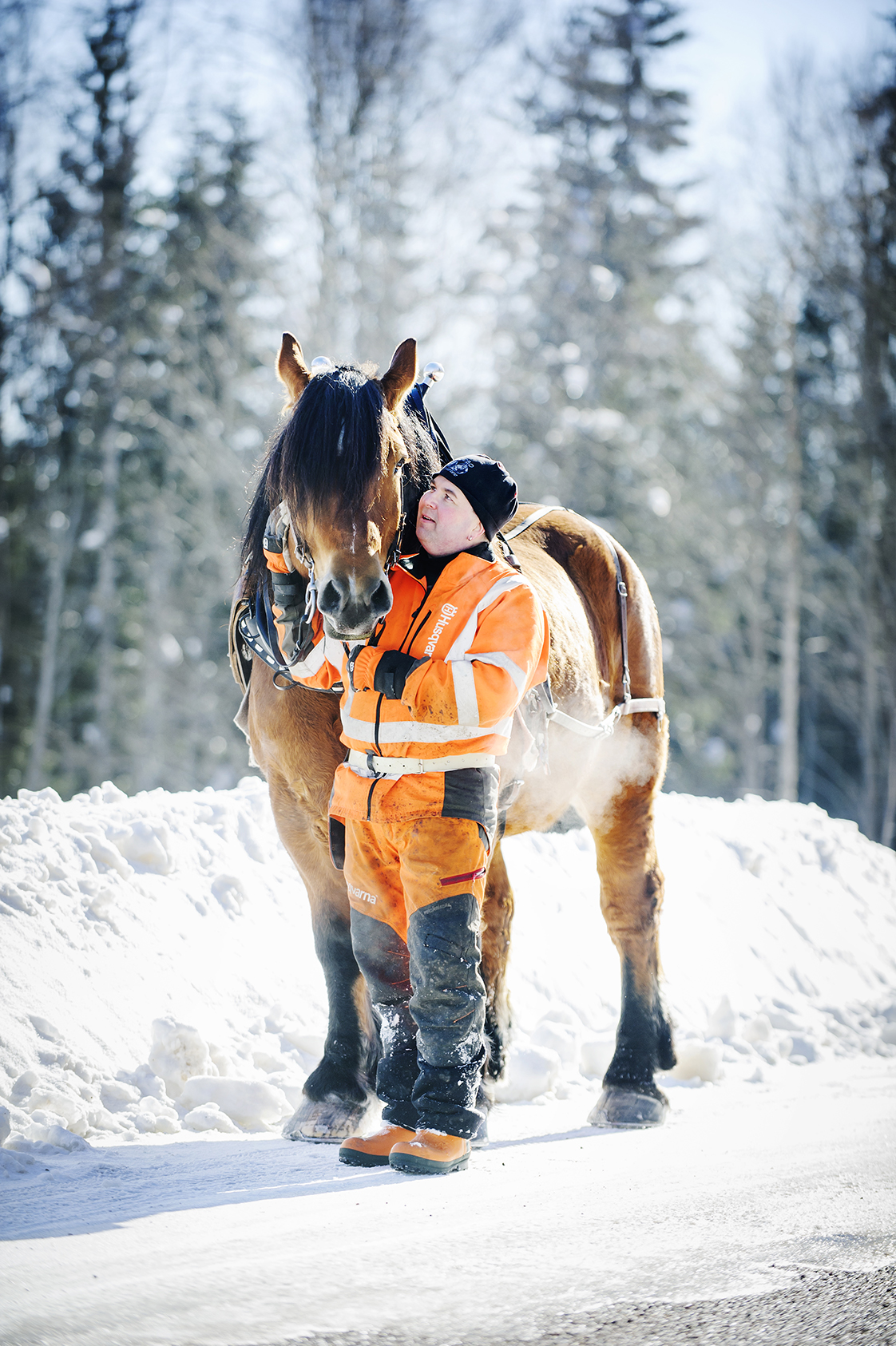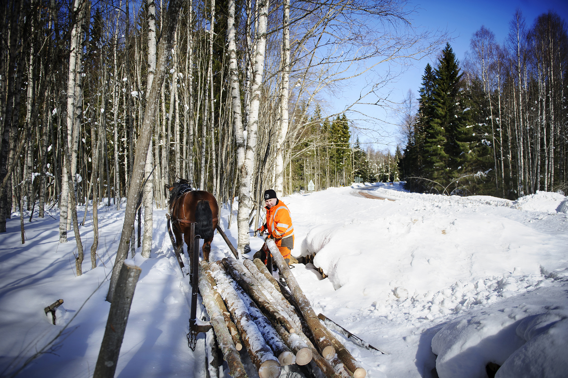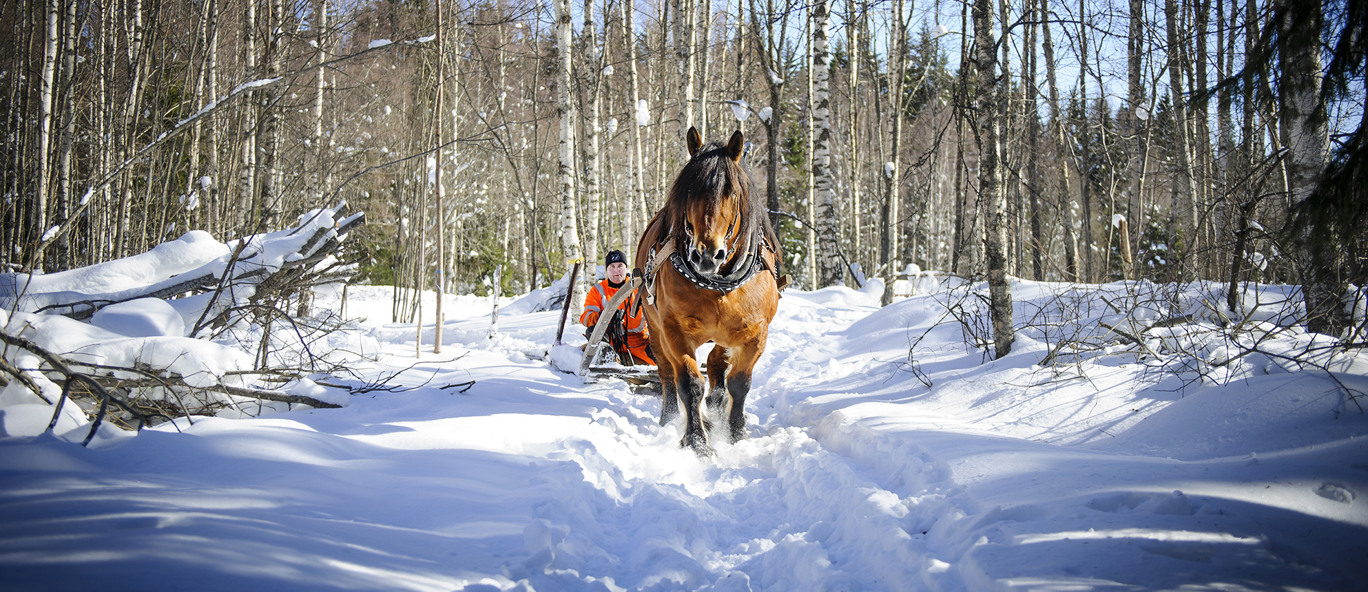Snön virvlar kring de stora hovarna och andedräkten ryker när ardennerhästen Sixten drar i väg med timmersläden mellan träden. Han är en stadig bit, väger nästan ett ton. Jämfört med stora skogsmaskiner är han ändå ett riktigt precisionsinstrument som tar sig fram i smala luckor mellan stammar och drar fram timmer utan att skada marken. Det enda ekipaget lämnar efter sig är spår efter hovar och medar i snön.