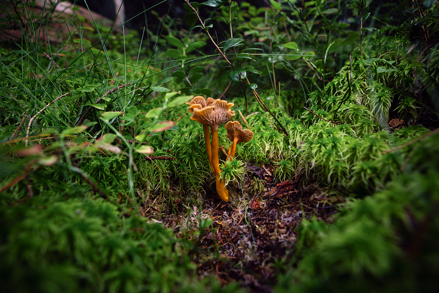 Rotar man lite i mossan under en trattkantarell kan man se det vita luddet av underjordiska svamptrådar.