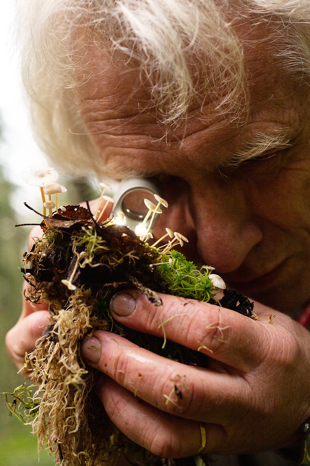 Han vänder mosstäcket upp och ner ovanpå ett stenblock och pekar på gula myceltrådar, som supersegt tuggummi utdraget i smala trådar och klumpar.