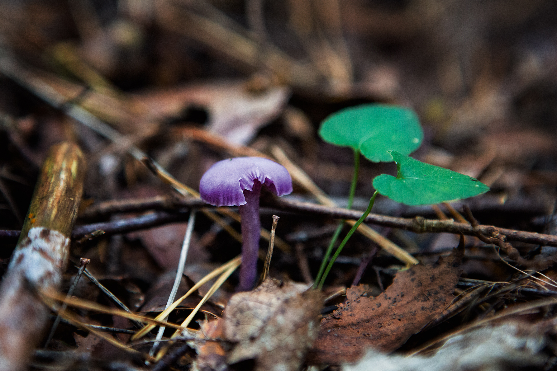 Den lilla nagelskivlingen växer på ruttnande svampar.