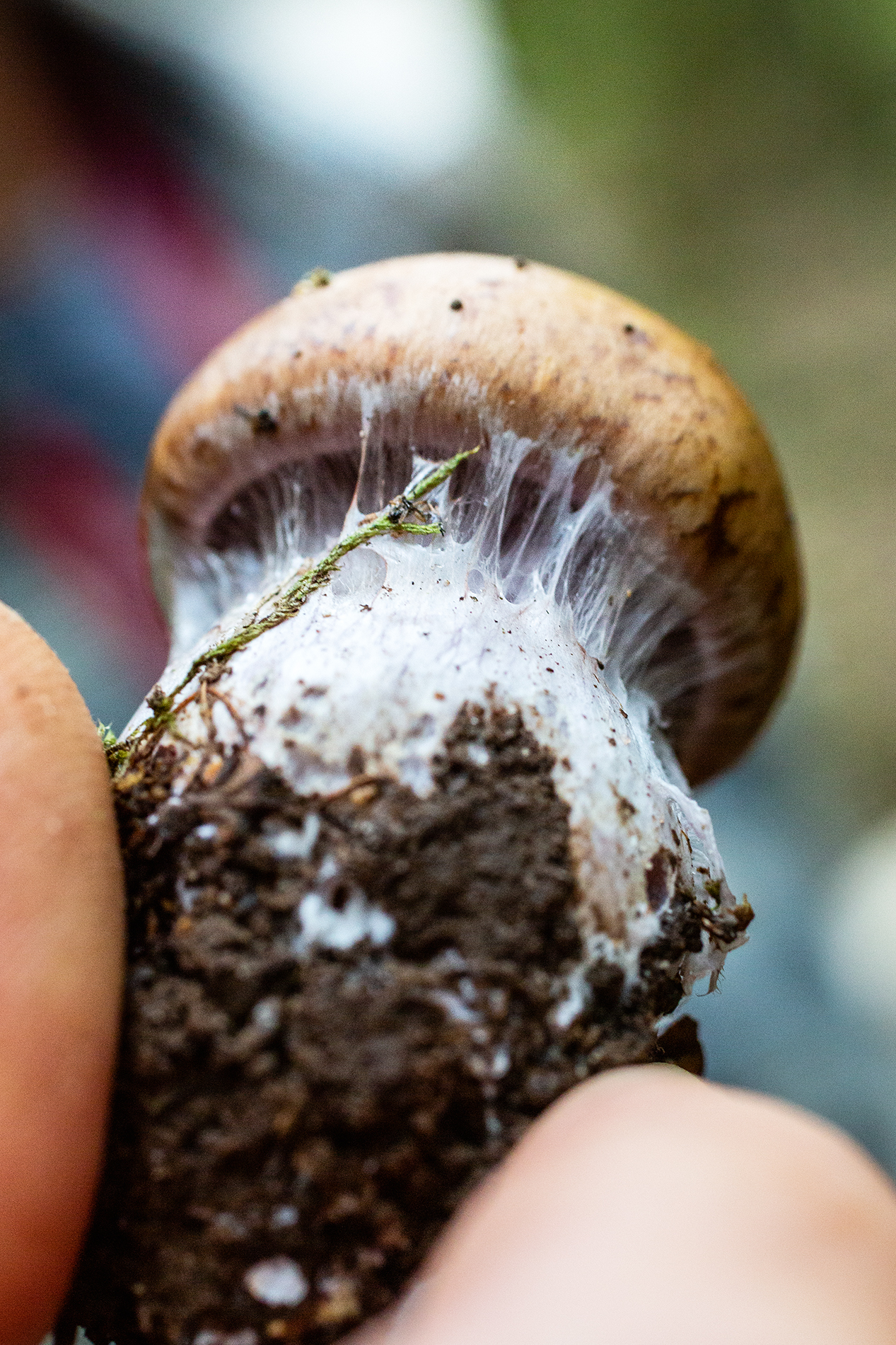 För att illustrera detta lyfter Anders Dahlberg upp en ung spindelskivling med karakteristisk ”spindelväv” mellan hatten och foten. Den är en av 500 spindelskivlingar som de flesta svampplockare helt ignorerar. De flesta av oss har ett gäng svampar vi känner igen och sedan har vi en anonym massa.