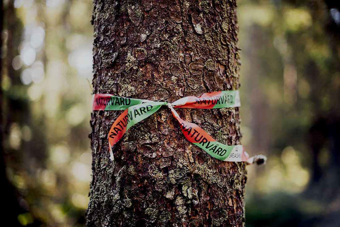 Vi står i en till synes helt vanlig blåbärsskog, men det är en ovanligt fin sådan med djupt mosstäcke och lavar på träden. Ståtliga furor signalerar hög ålder. Den tretåiga hackspetten har lämnat spår i barken på gamla, grova granar. Gammelgranlav längst ned på stammarna och blåmossa på marken visar på naturvärden, liksom tjäderspillningen i en glänta. Åldern på det här skogspartiet är uppmätt till cirka 110 år. Här och var hänger gul-röda snitslar med Sveaskogs logotyp. De markerar att skogen ska avverkas.