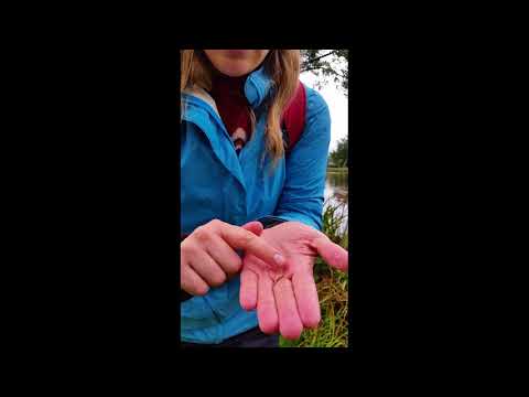 Mitt i Höör stannar vi vid en liten damm, Tjurasjö. Det är fortfarande mulet och inga sländor i luften, men Linda håvar upp en flicksländelarv som får krypa på hennes hand.