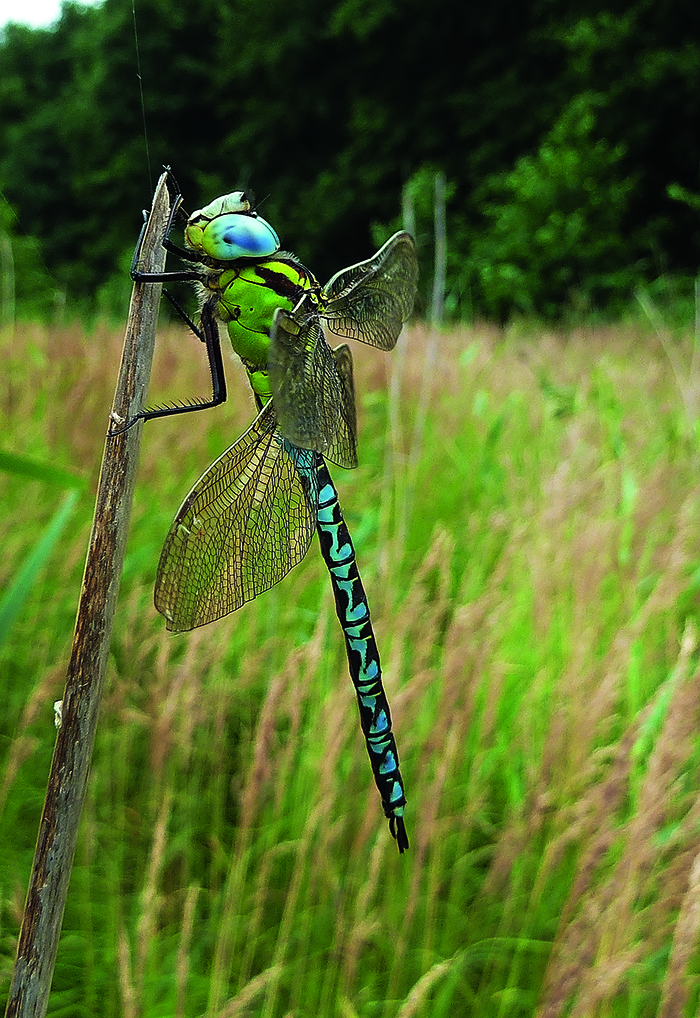 – Där, en grön mosaikslända, riktigt knallgröna facettögon! Många tycker att den här arten är den allra vackraste.