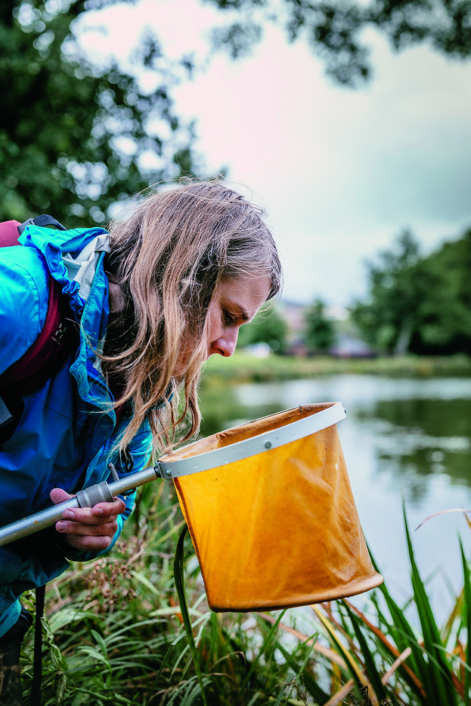– Blågrön mosaikslända, en hanne. Visst är den vacker? frågar hon just som vingarna prasslar till och lyfter den ut över vattnet.