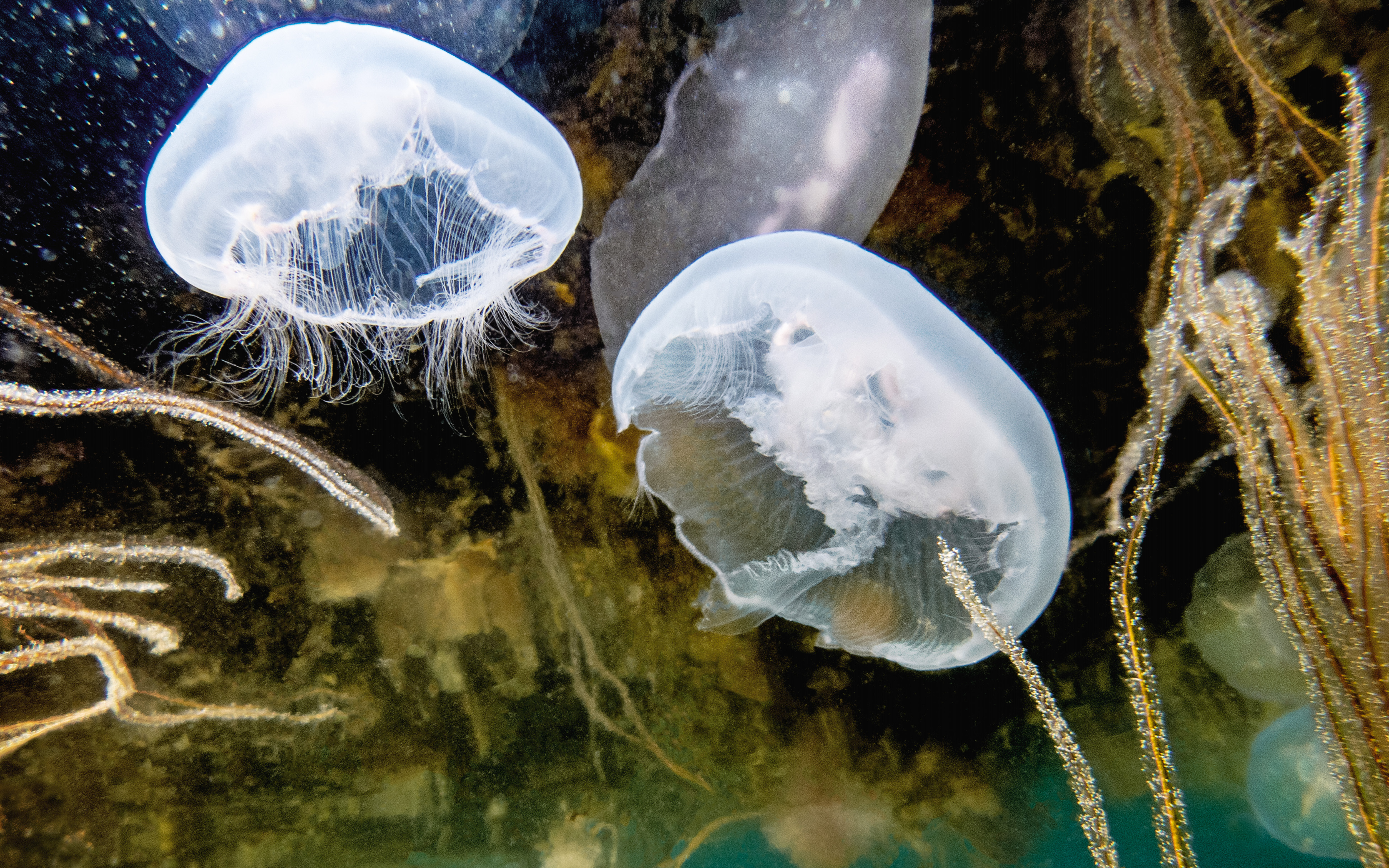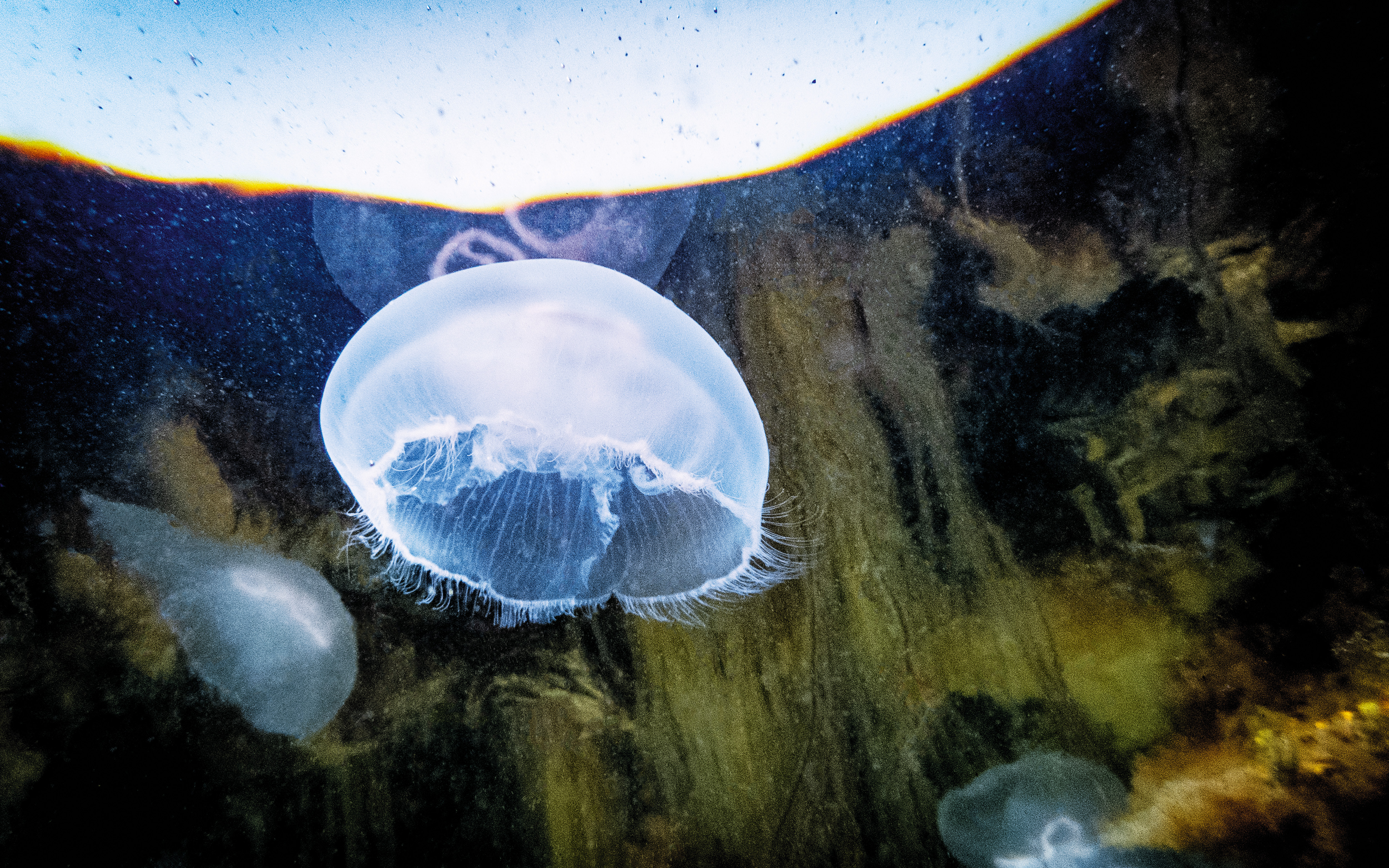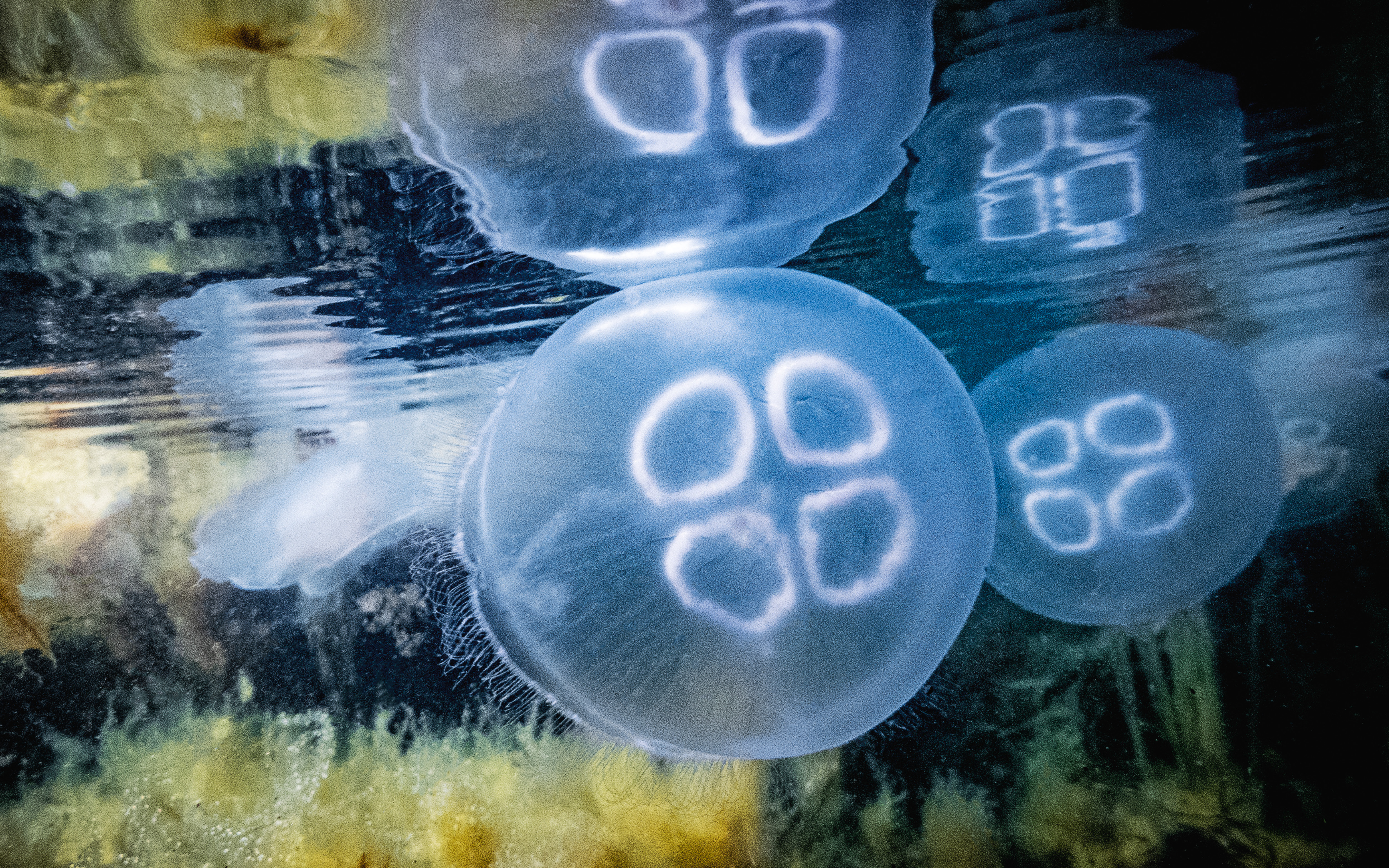 Likt tefat i rymden svävar dessa öronmaneter runt i vattnet. Öronmaneten är den vanligaste maneten i Sverige och finns både på västkusten och i Östersjöns bräckta vatten.