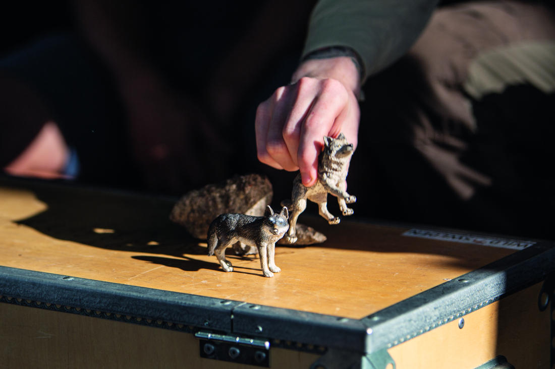 På en trälår bygger Marcus Eldh upp ett litet vargrevir i miniatyr med hjälp av kottar, stenar och plastvargar. Han förklarar att vi nyss var alldeles nära vargarnas rendezvous-plats. Det kan översättas som en mötesplats, där vargvalparna väntar medan föräldrarna är ute på jakt om natten.