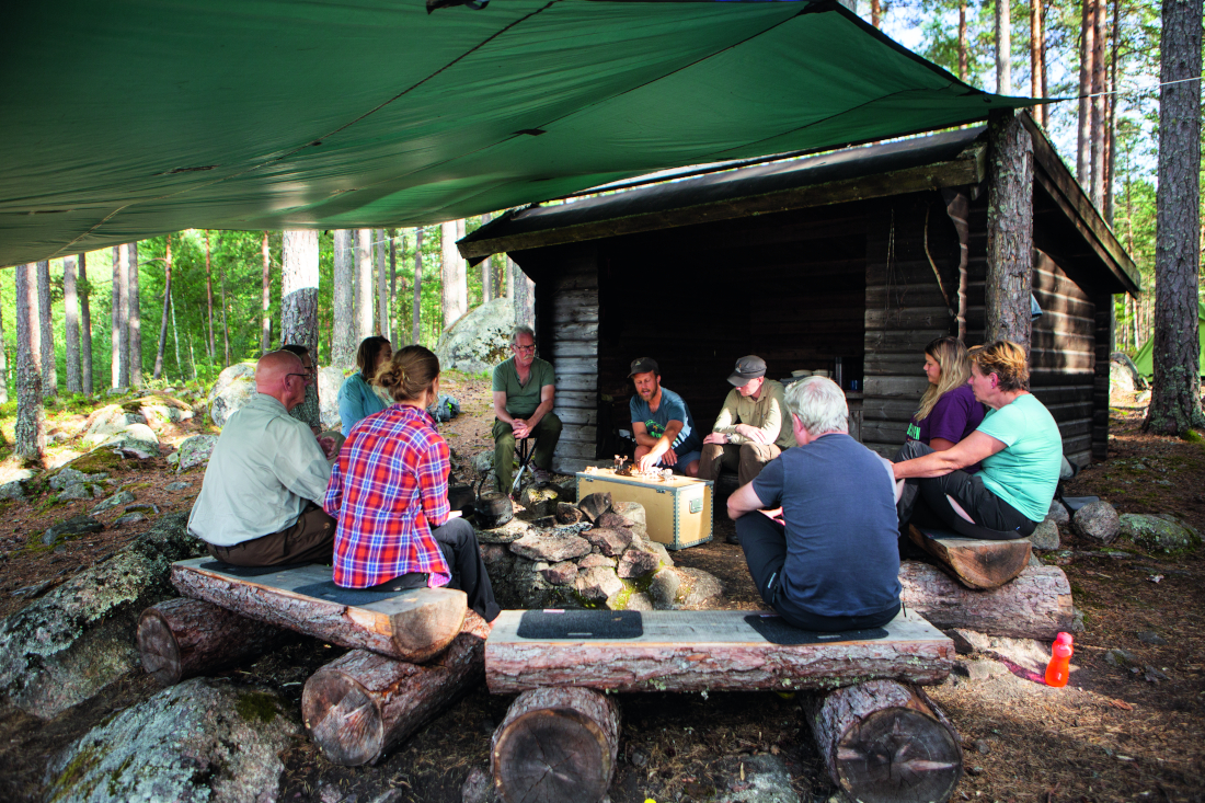 Ska man behöva viska i hela detta gigantiska revir? Förklaringen kommer vid lägerplatsen, när alla deltagare har fått varsitt tält att slå upp. Bland laviga tallstammar intill en liten sjö står ett vindskydd av grånat timmer. Sotade kaffepannor på elden och kådig röklukt. Vargarna är bara en ingrediens i denna ombonade vildmark.