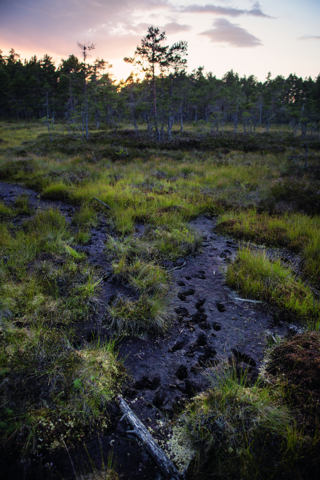 På vägen ut över myren korsar vi spår efter lekande vargvalpar. Vuxna vargar skuttar aldrig omkring så mycket.