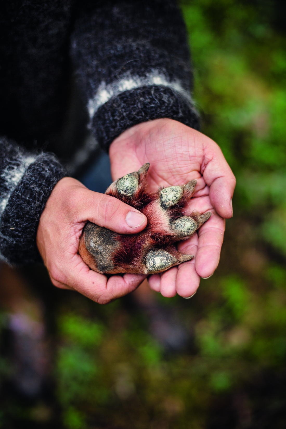 Sex deltagare och två guider kommer ut och står i en andäktig cirkel kring det som kunde ha varit en simpel hundlort. Fast på nära håll syns spretiga hår, hudrester och benbitar som sticker ut. Guiden Simon Green tar ett långt grässtrå och pekar ut en tand, troligen från en älgkalv som är vargarnas stapelföda. Väldigt få hundar har en sådan diet.