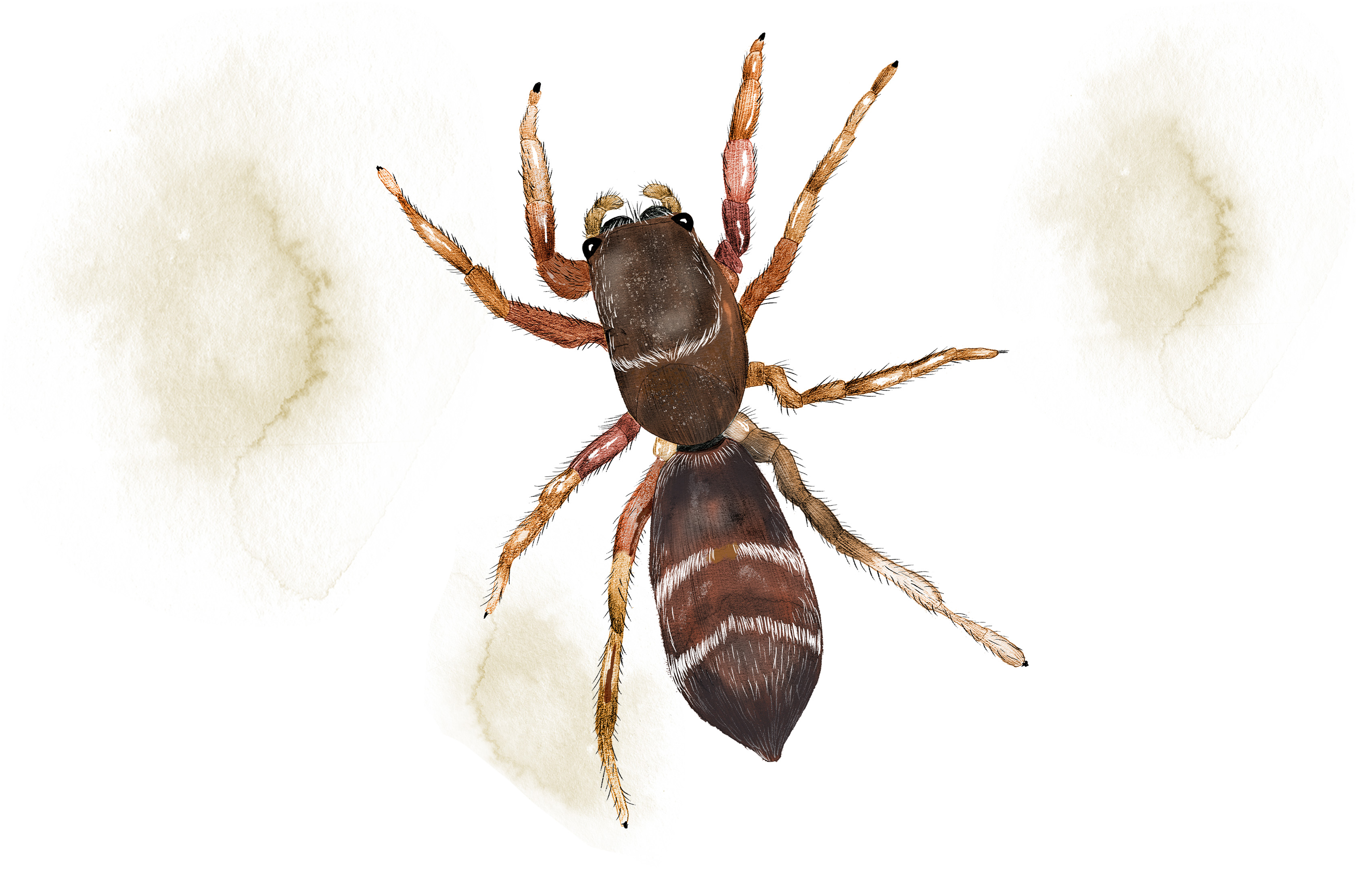 Här finns bland annat ett stort gäng hoppspindlar, som liknar myror, men som framför allt har lärt sig att härma myrornas gångstil och döljer sin egen åttabenthet genom att använda frambenen som antenner. En svensk sådan är smalmyrespindel som går att hitta på sjöstränder och havsstränder upp till södra Norrland.