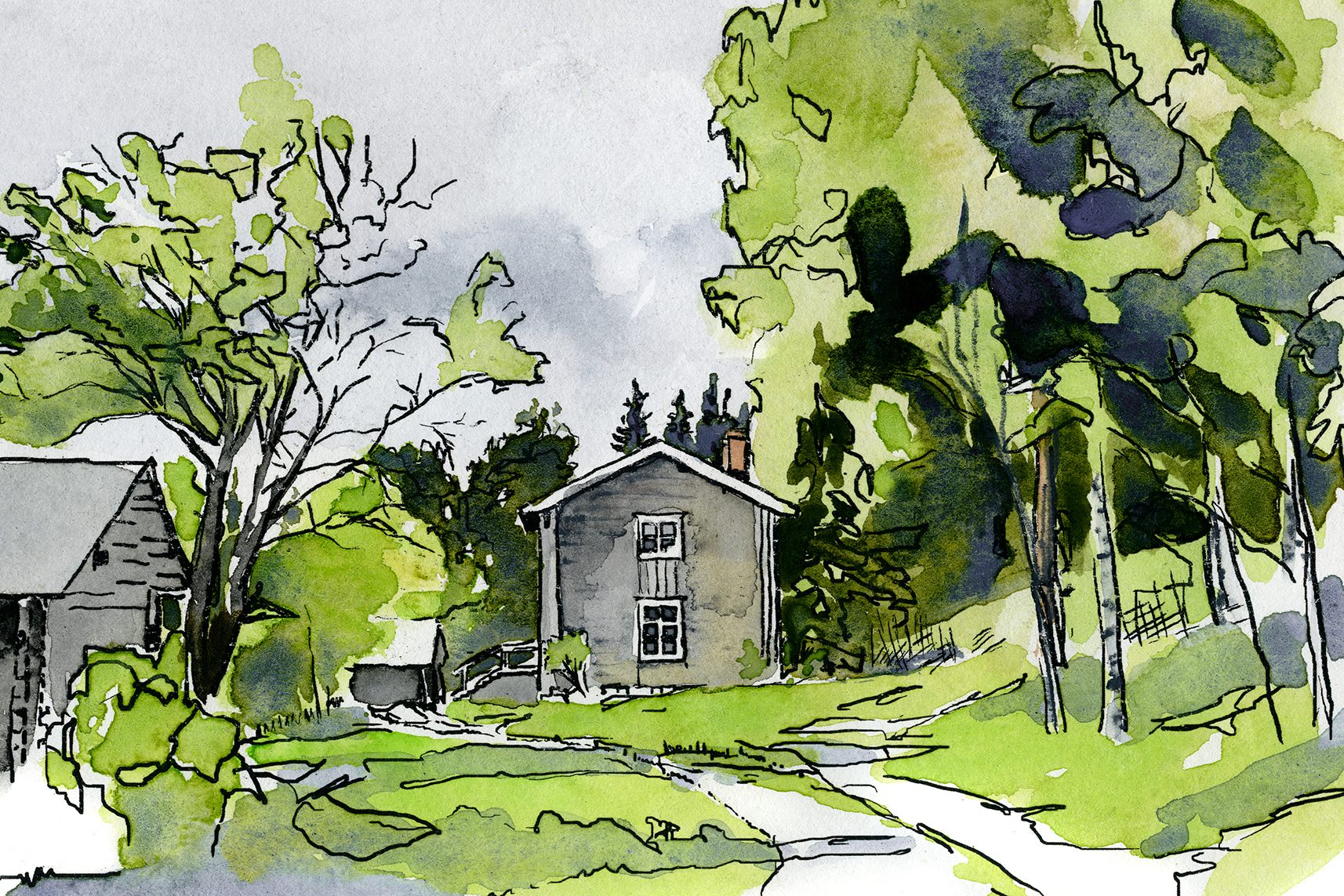 Rödblära och hundkex blommar mellan grånade uthus. Björktrastar gnisslar i rönnarna.