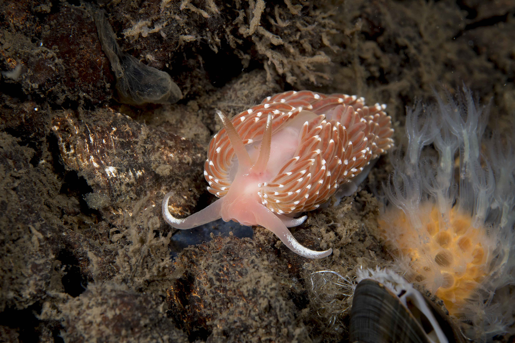 Variabel havscitron, rosa rusknuding och större snigelkott. Nakensnäckorna glide…
